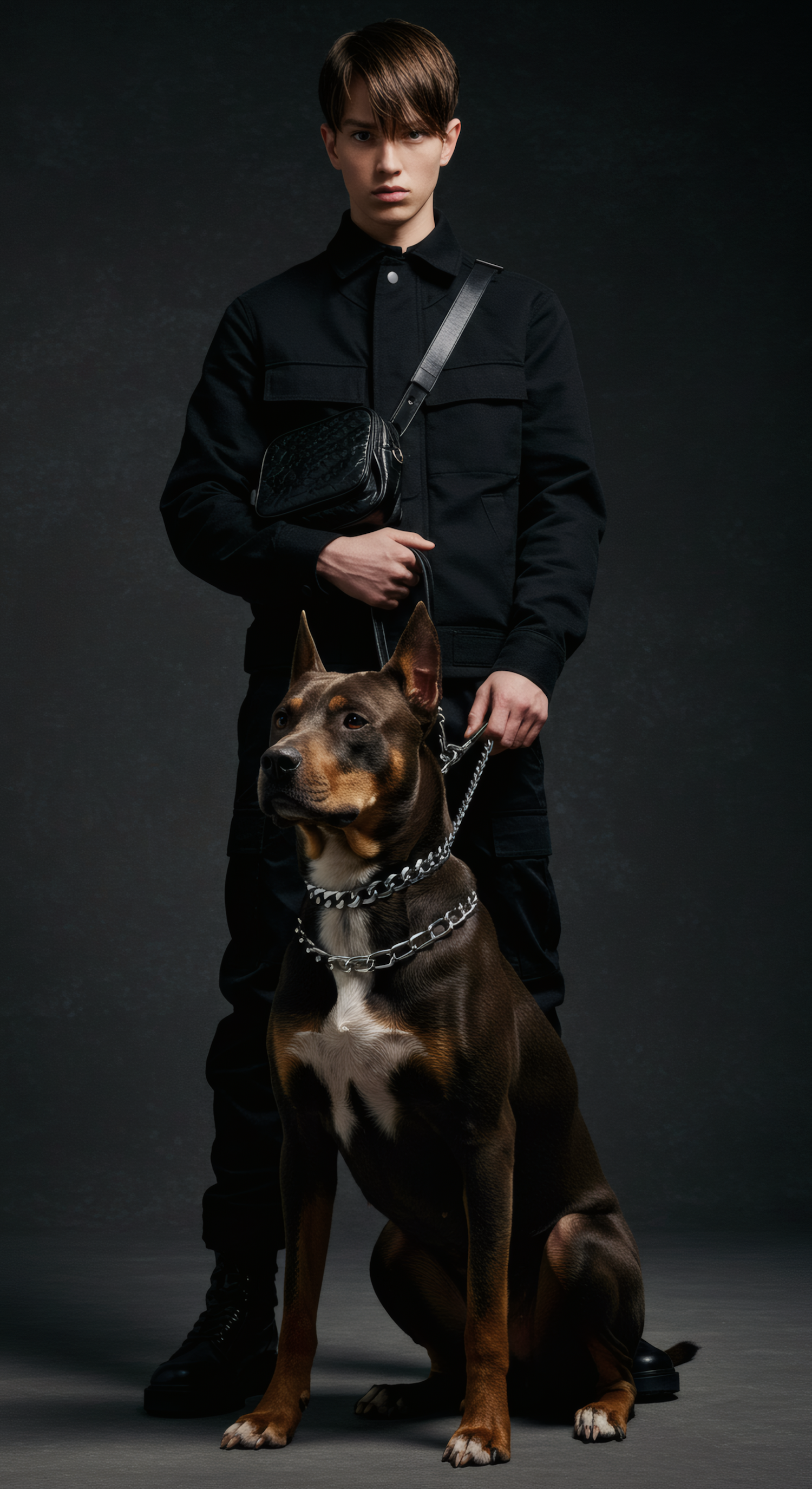 Young man in black attire with a crossbody bag stands with a large brown dog on a chain leash against a dark background.