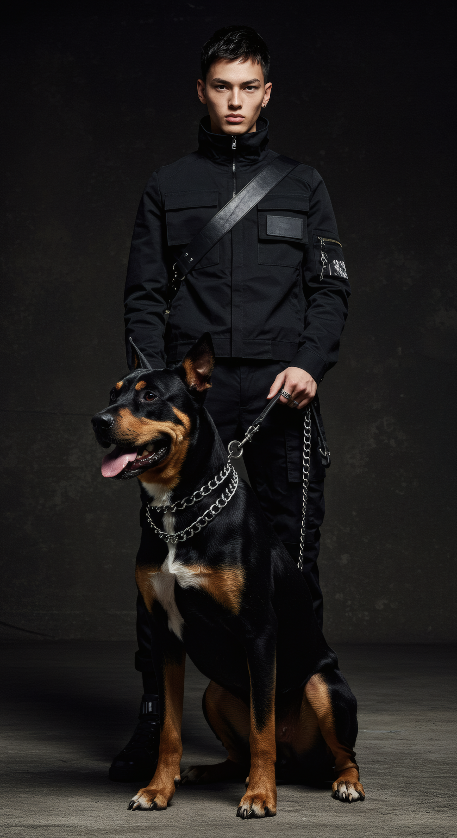 Young man in black outfit with a large black and tan dog on a chain leash, set against a dark background.