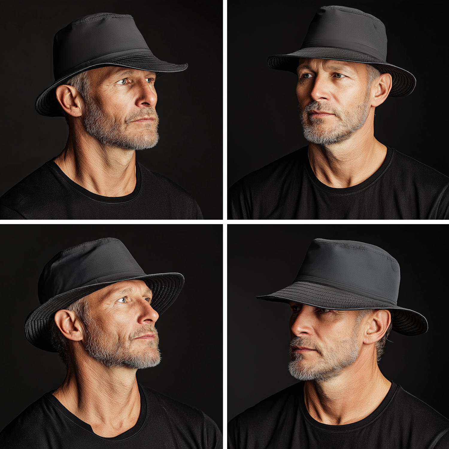 Collage of a middle-aged man in a gray fedora, showcasing different angles against a black background.