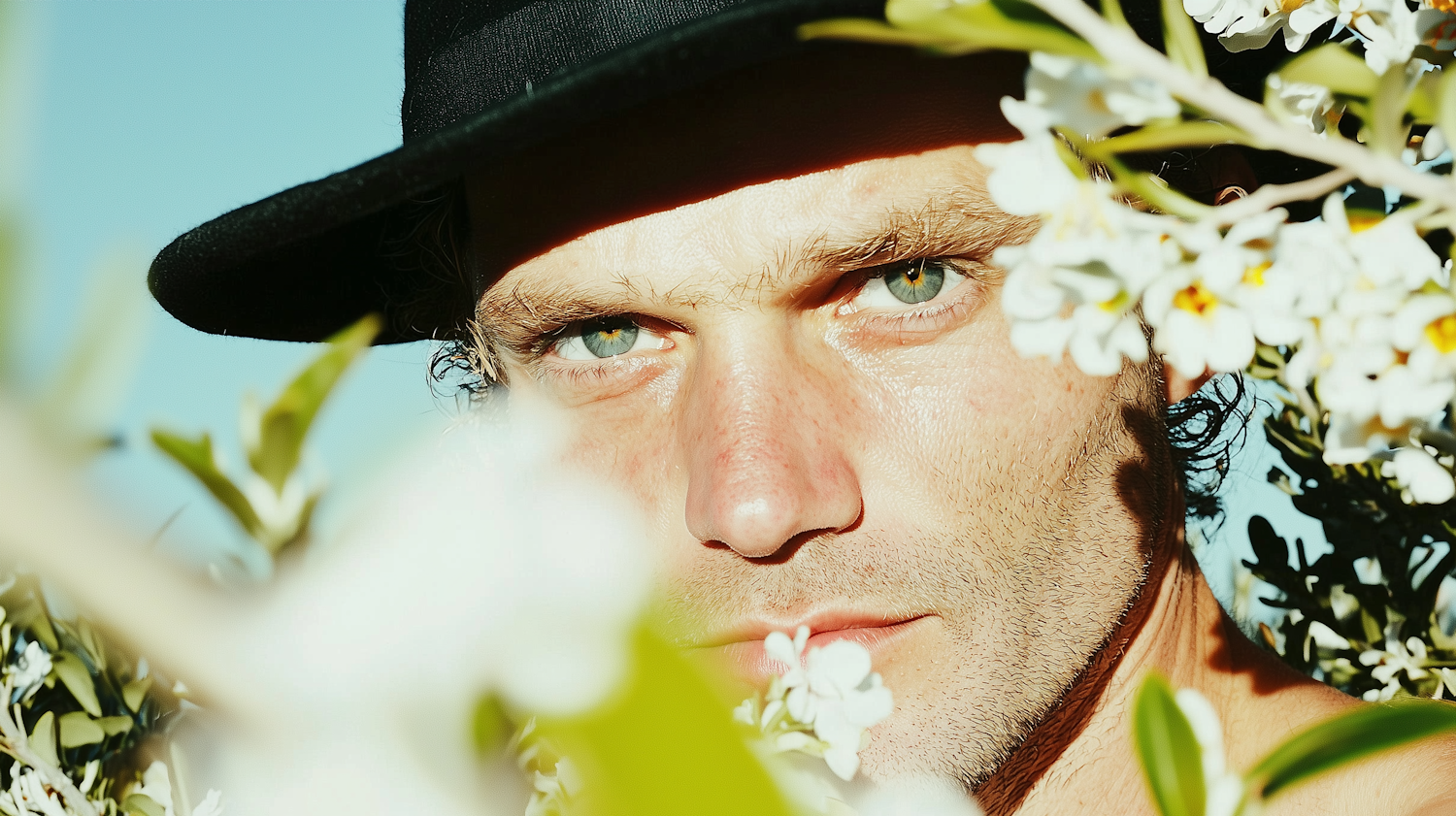 Close-up of a man with green eyes and a black hat, framed by white flowers and leaves, under a bright blue sky.