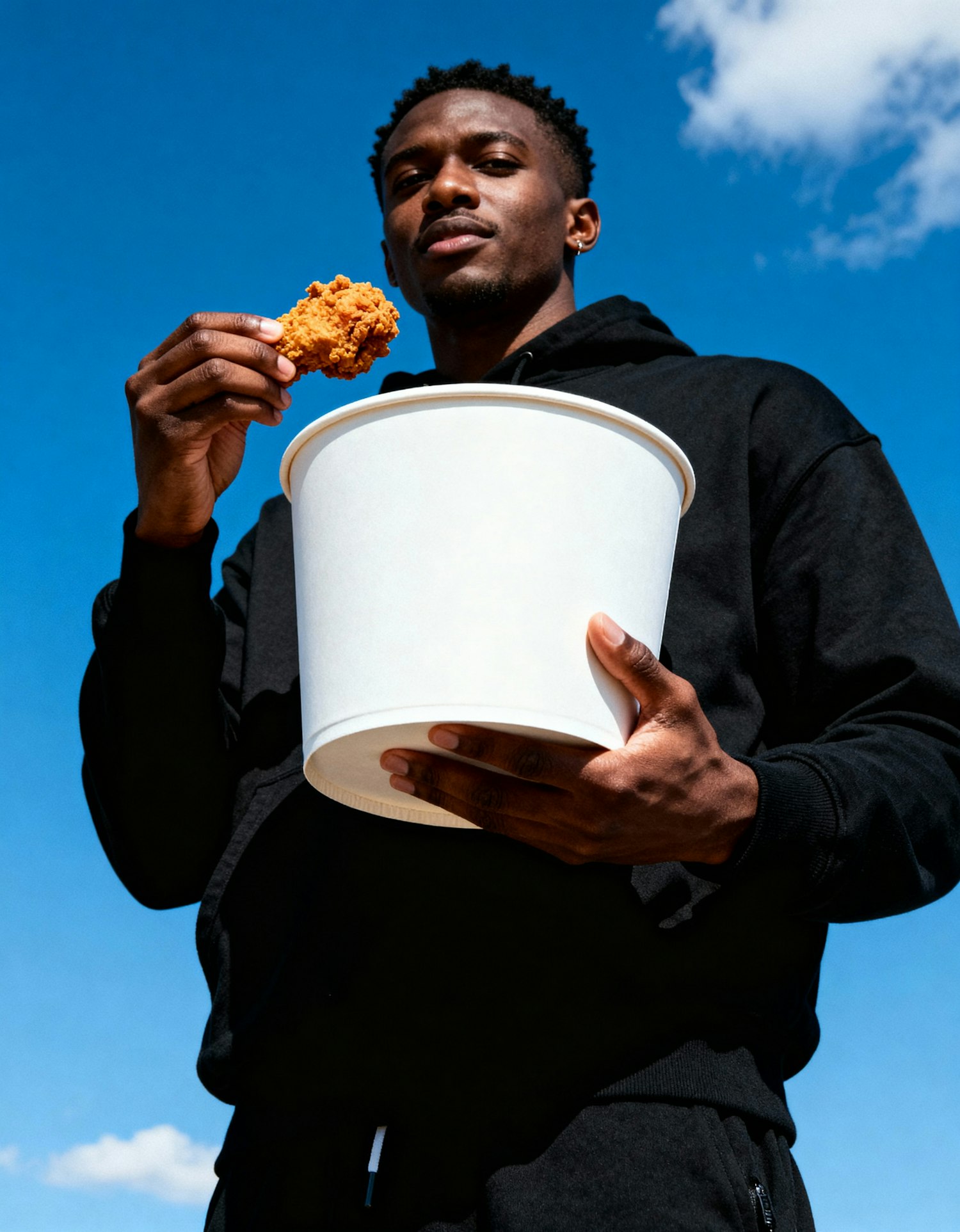 A man in a black hoodie holds a bucket and a piece of fried chicken against a bright blue sky with scattered clouds.