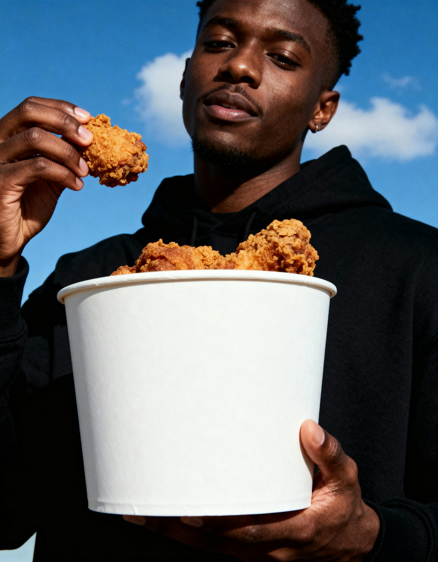 A man in a black hoodie holds a bucket of crispy fried chicken under a bright blue sky with clouds, enjoying a piece of chicken.