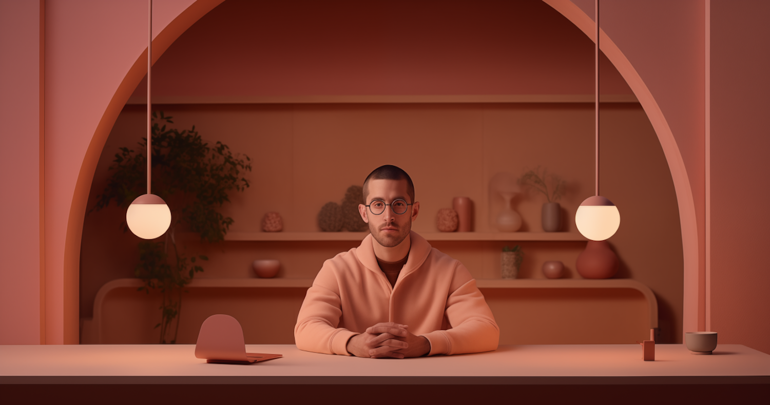Man in peach-toned room with modern decor, wearing glasses and hoodie, under soft pendant lights. Minimalist and stylish setting.