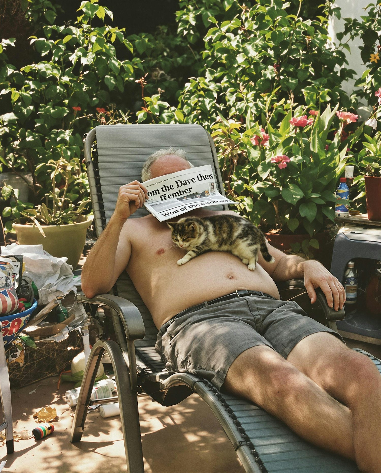 Natural daylight photo with warm tones and subtle contrast, slightly overexposed highlights, soft shadows, and a light analog grain. Vibrant but realistic colors with a summery, editorial feel. The photo should look candid, fun, and lightly ironic, with a touch of spontaneity and humor. An older man sunbathing in a recliner, socks pulled up, newspaper over his face, while a mischievous cat walks across his stomach. The setting is a messy patio with overgrown plants.