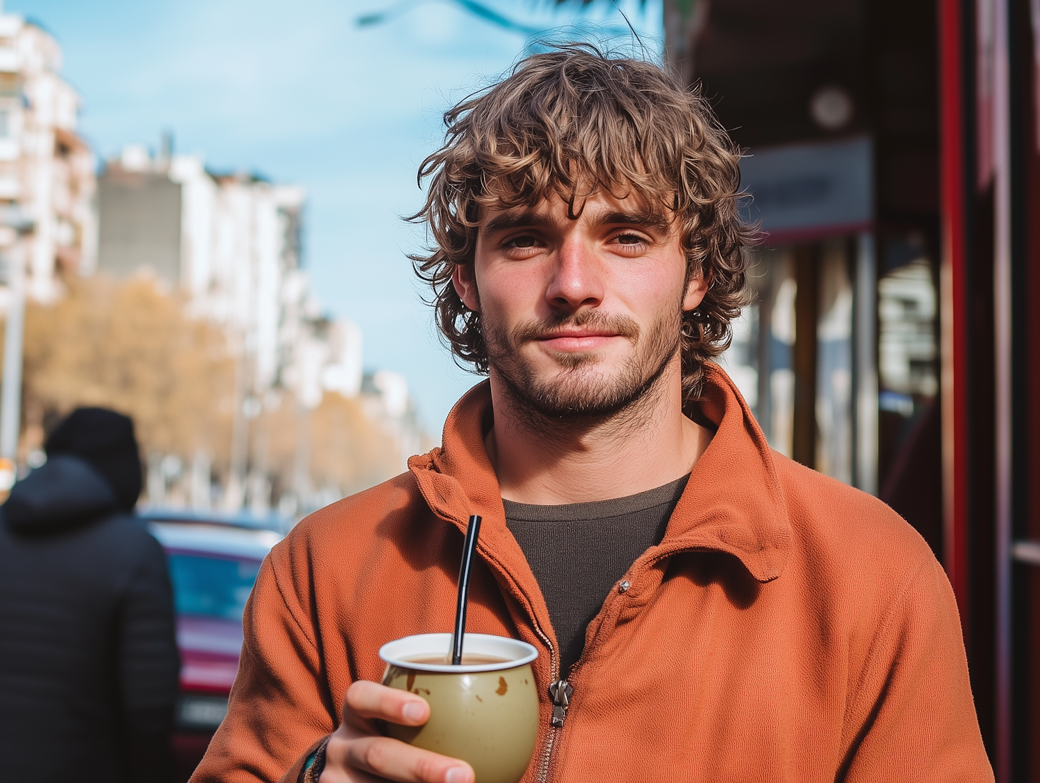 Young man with wavy hair and orange jacket holding a mate cup on a sunny day in a city street. Relaxed and casual vibe.