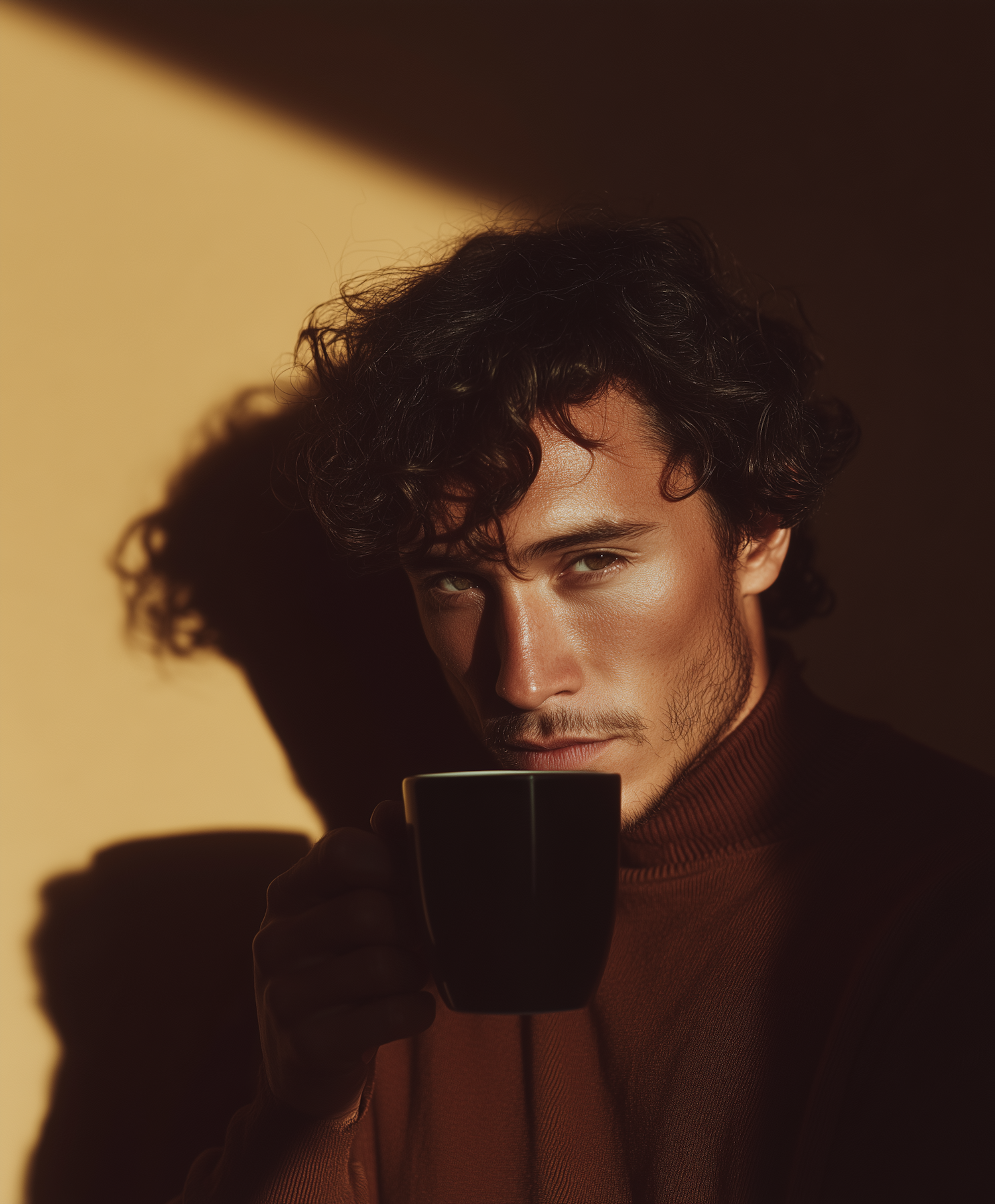 A man in a brown turtleneck holds a black mug, bathed in warm sunlight with dramatic shadows on a beige background.