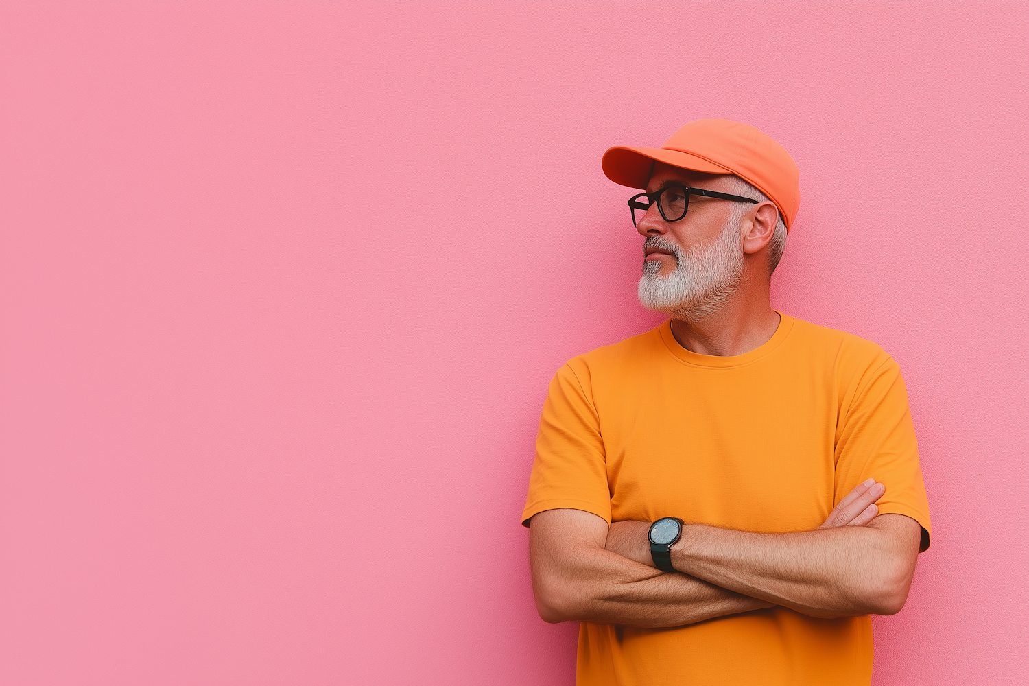 Caucasian man with white beard in orange outfit against pink background, looking sideways with arms crossed.