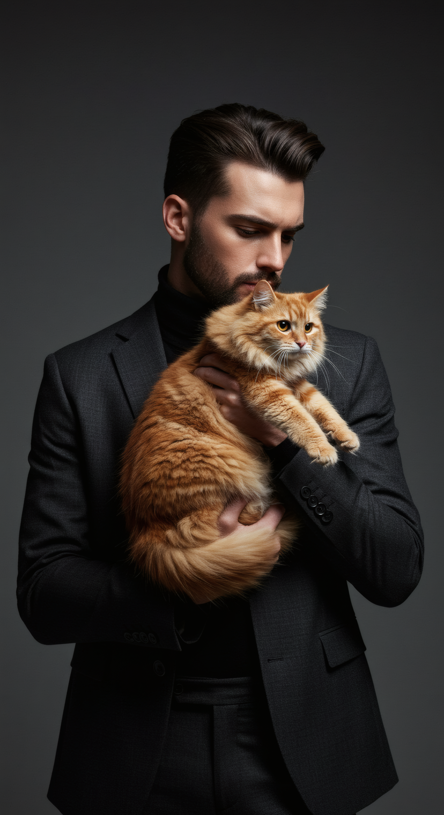 Caucasian man in a dark suit holding a fluffy orange cat, set against a dark background.
