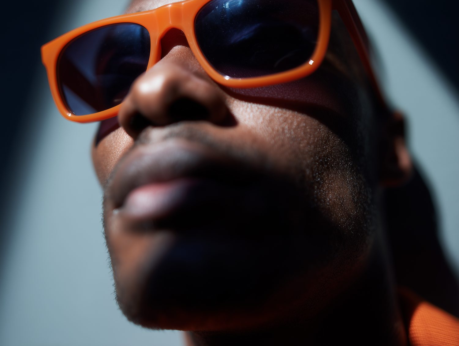 Close-up of a man wearing bold orange sunglasses with dramatic lighting and shadows highlighting his facial features.