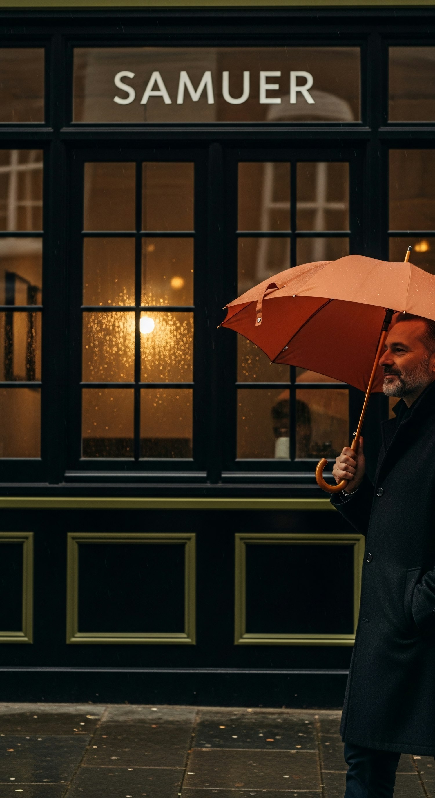 Man with orange umbrella walking past a stylish storefront named 'SAMUEL' on a rainy day, with warm light glowing inside.