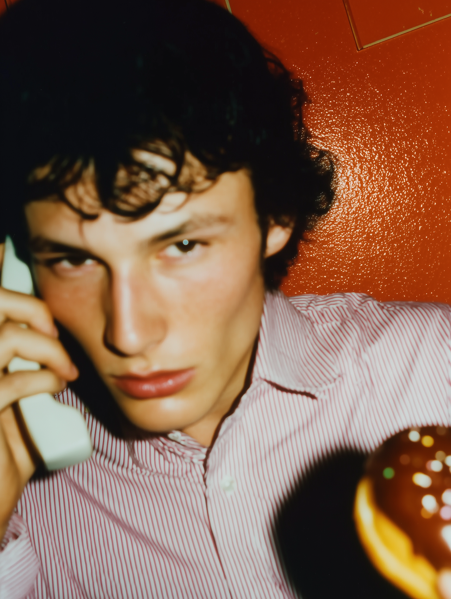 Close-up of a young man with dark curly hair holding a phone, with a chocolate donut in the foreground and an orange background.