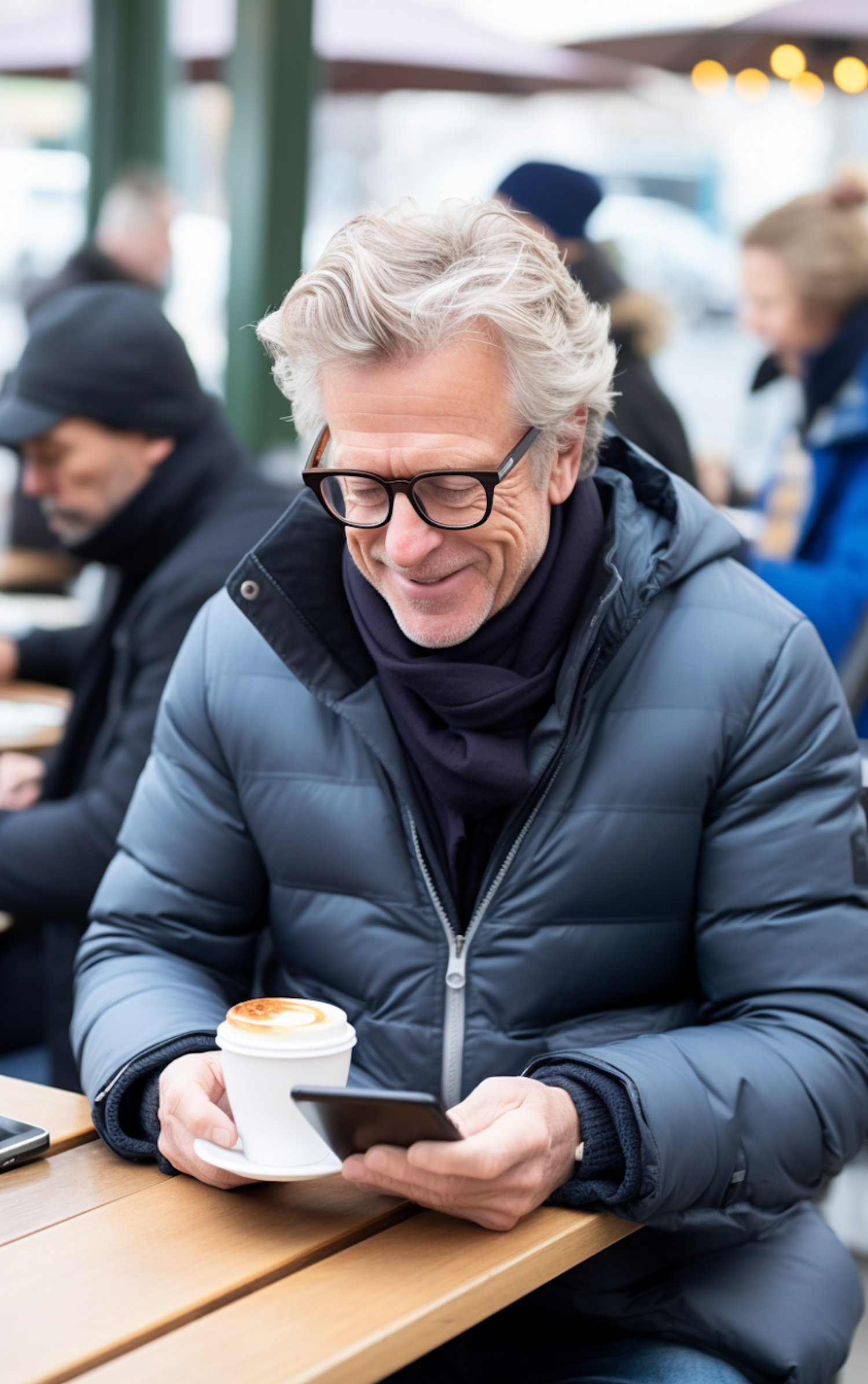 Smiling man in glasses enjoys coffee at an outdoor café, wearing a blue puffer jacket and using his smartphone.