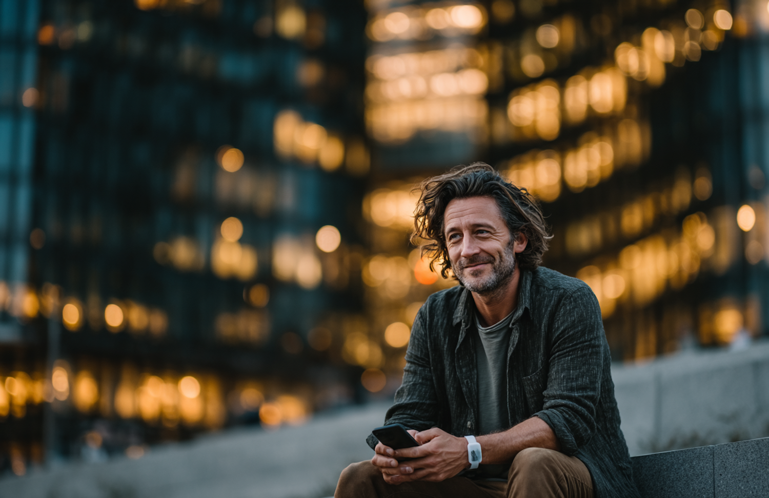 Man with wavy hair and a smartwatch sitting outdoors, holding a phone, with a glowing cityscape in the background.