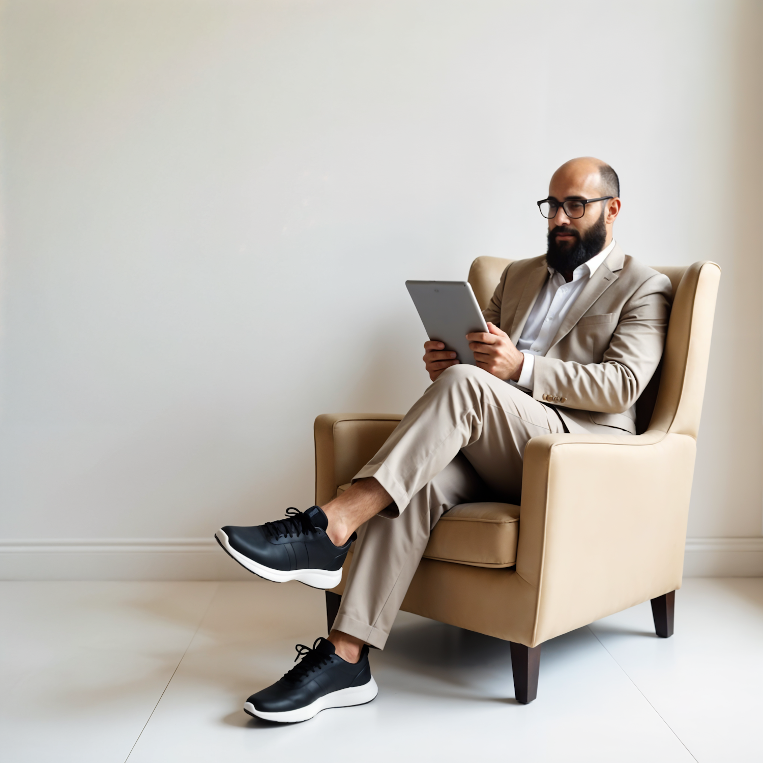 Man in beige suit and black sneakers sits in a beige armchair, holding a tablet, against a plain white wall. Minimalist and modern vibe.