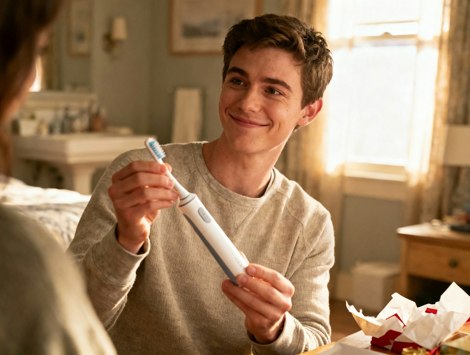 A candid, emotionally authentic UGC-style image of a young adult unboxing or holding a newly gifted electric toothbrush. The person looks pleasantly surprised and genuinely touched — a small, real smile spreading as they examine the toothbrush with curiosity and gratitude. Their eyes aren’t locked on the camera; they’re looking down at the product or toward the gift-giver just out of frame, giving the sense of a lived-in, human moment. The setting is a softly lit home environment — morning light through a window or cozy indoor lighting at night. Background elements suggest warmth and routine: a bathroom counter, a tidy bedroom, or a kitchen table with gift wrap remnants nearby. Lighting is natural and diffused, with gentle highlights on the product to make it subtly stand out. A slightly warm color temperature (around 5200K) enhances the emotional tone of intimacy and joy. Camera angle is handheld and close — around chest to eye level — framed imperfectly, like a spontaneous smartphone shot. A shallow depth of field softly blurs the background, drawing focus to the subject’s expression and the toothbrush in their hands. There’s a sense of movement, as if captured mid-laugh or mid-unboxing. The subject’s posture is relaxed and expressive — shoulders slightly raised in surprise or leaning forward with genuine interest. Clothing is casual: soft textures, neutral tones, nothing stylized. The overall mood is personal and real: a slice of life that feels relatable, heartfelt, and unposed. The image tells a micro-story — the small joy of receiving a thoughtful, useful gift — rather than selling a product