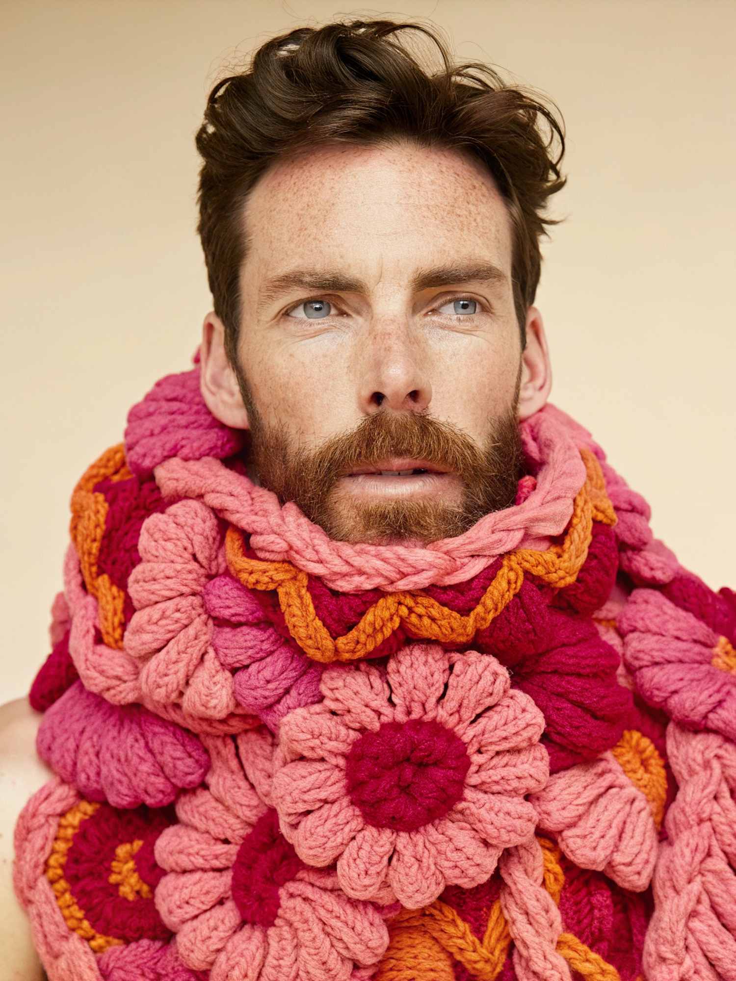 Man with a beard wearing a vibrant floral knitted scarf, gazing thoughtfully. The scarf features bold pink, red, and orange hues.