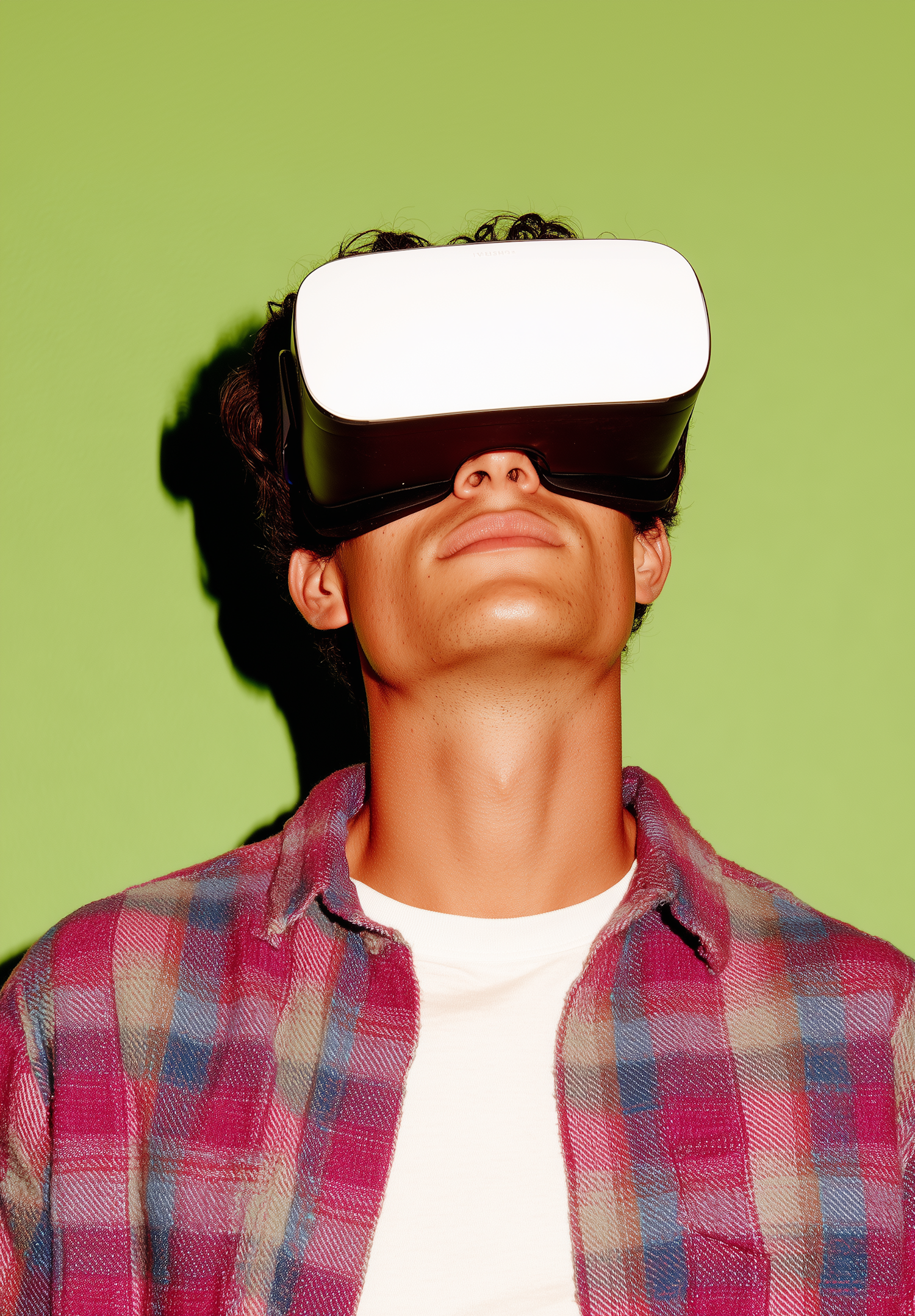 A young man in a plaid shirt and VR headset looks upward against a vibrant green background, immersed in virtual reality.