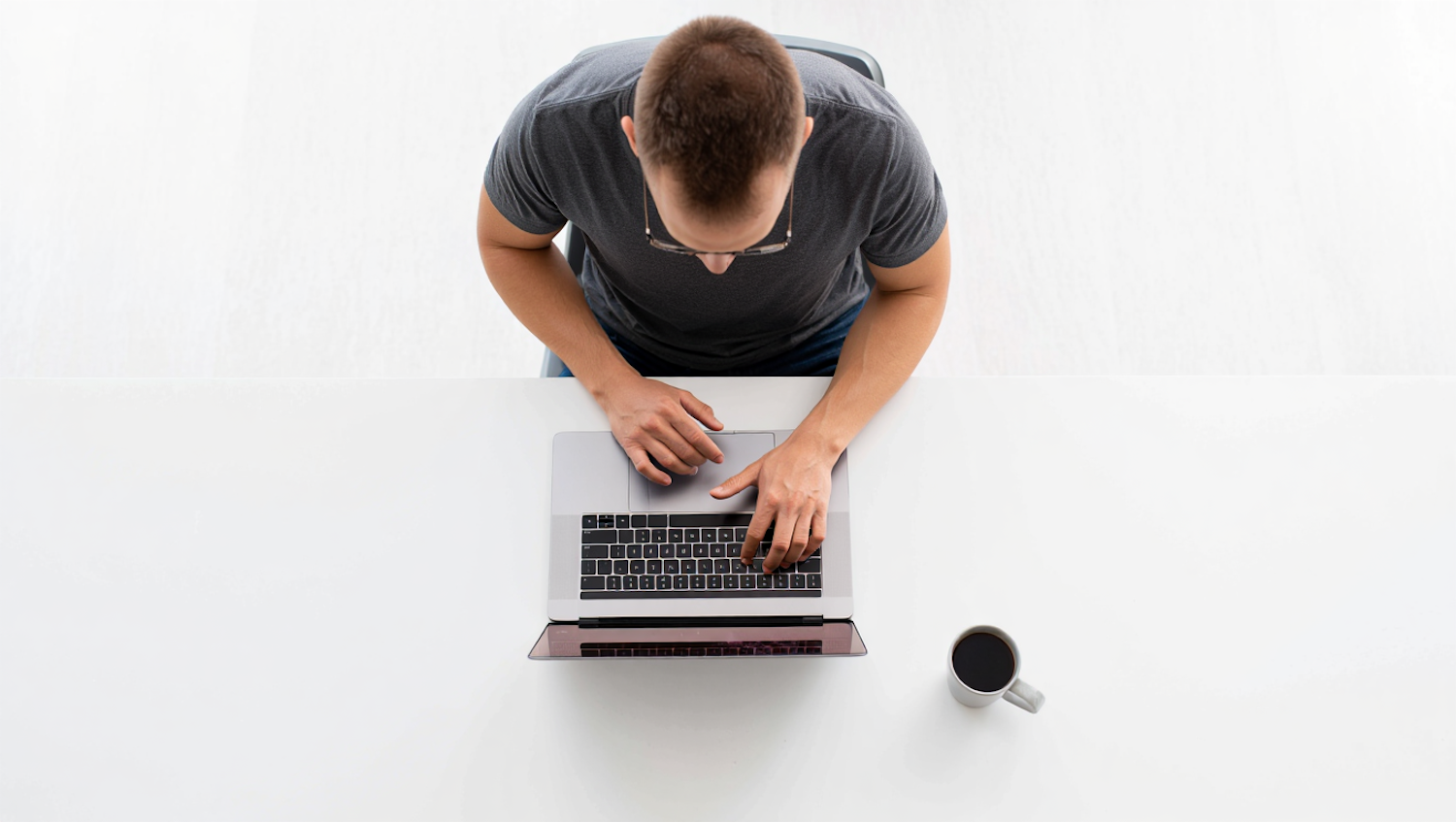 Overhead view of a man typing on a laptop at a white desk with a cup of coffee. Minimalist workspace with a clean, modern vibe.