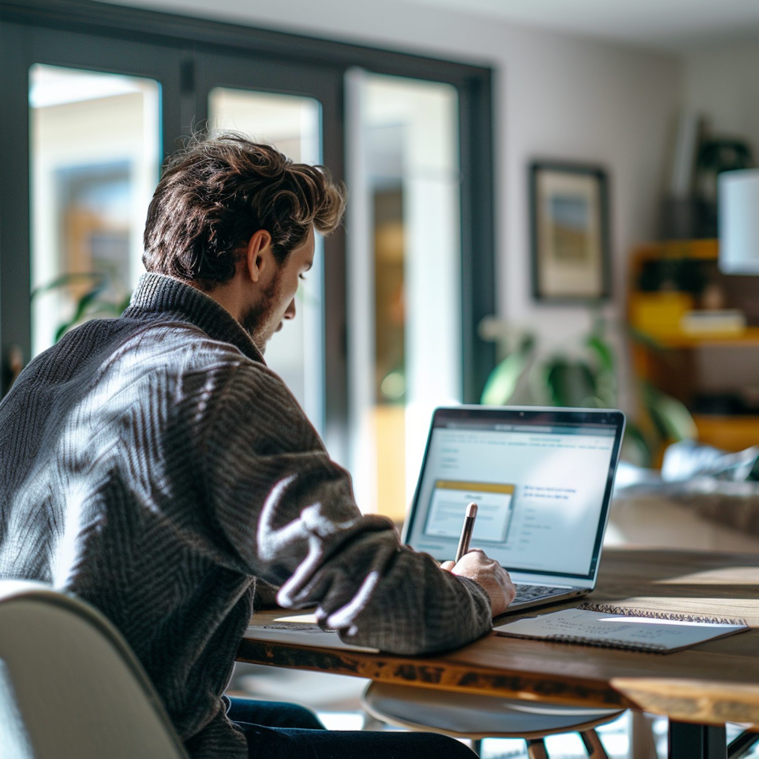 Man in gray sweater working on a laptop at a wooden table, taking notes in a bright, cozy home office setting.