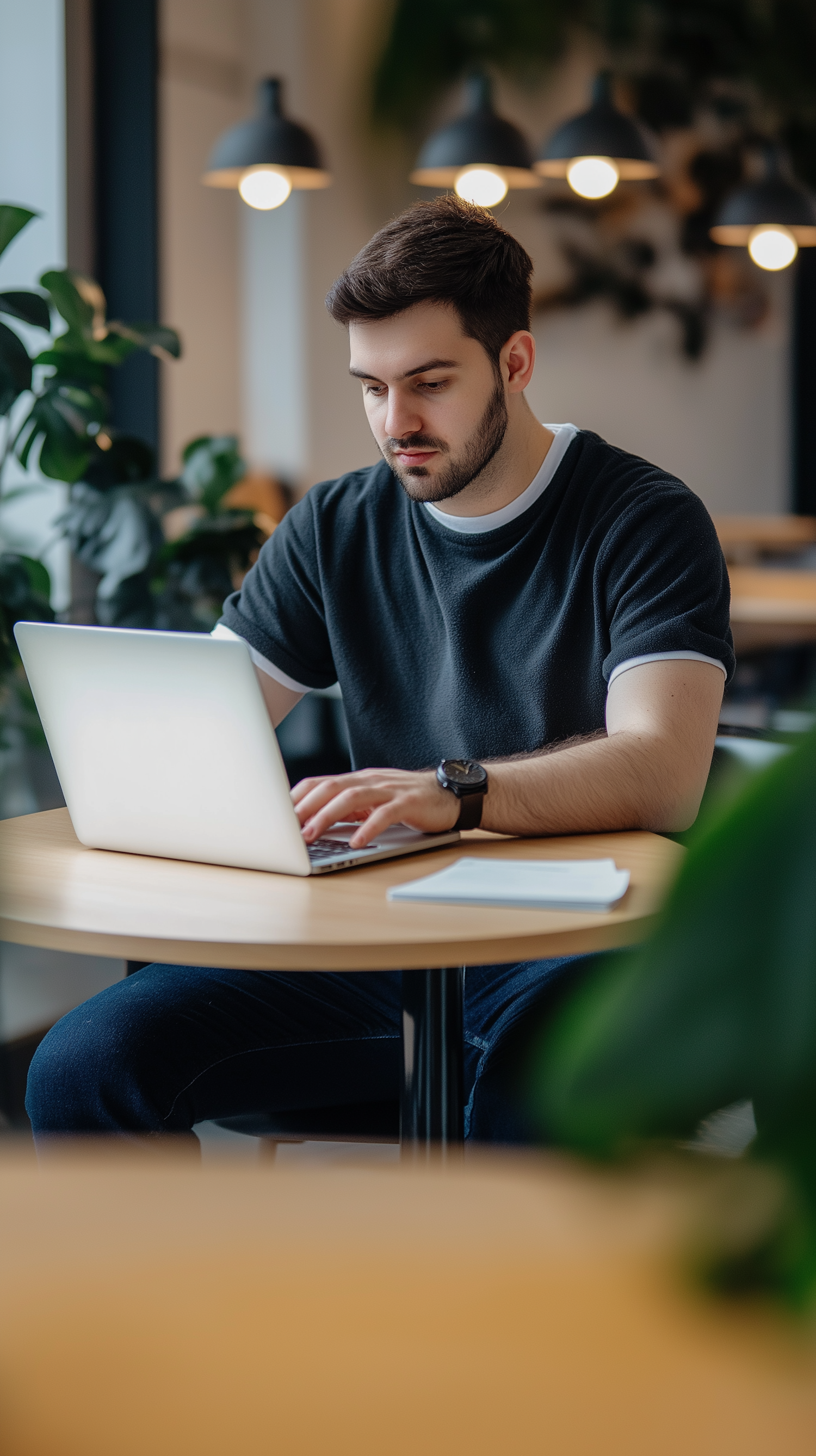 Focused young man working on a laptop in a cozy cafe with modern decor and greenery, creating a productive atmosphere.