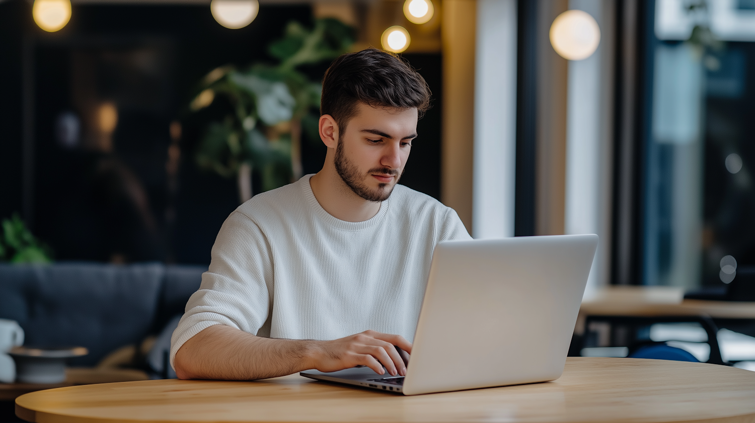 Young man in a white sweater working on a laptop in a cozy cafe with warm lighting and modern decor.