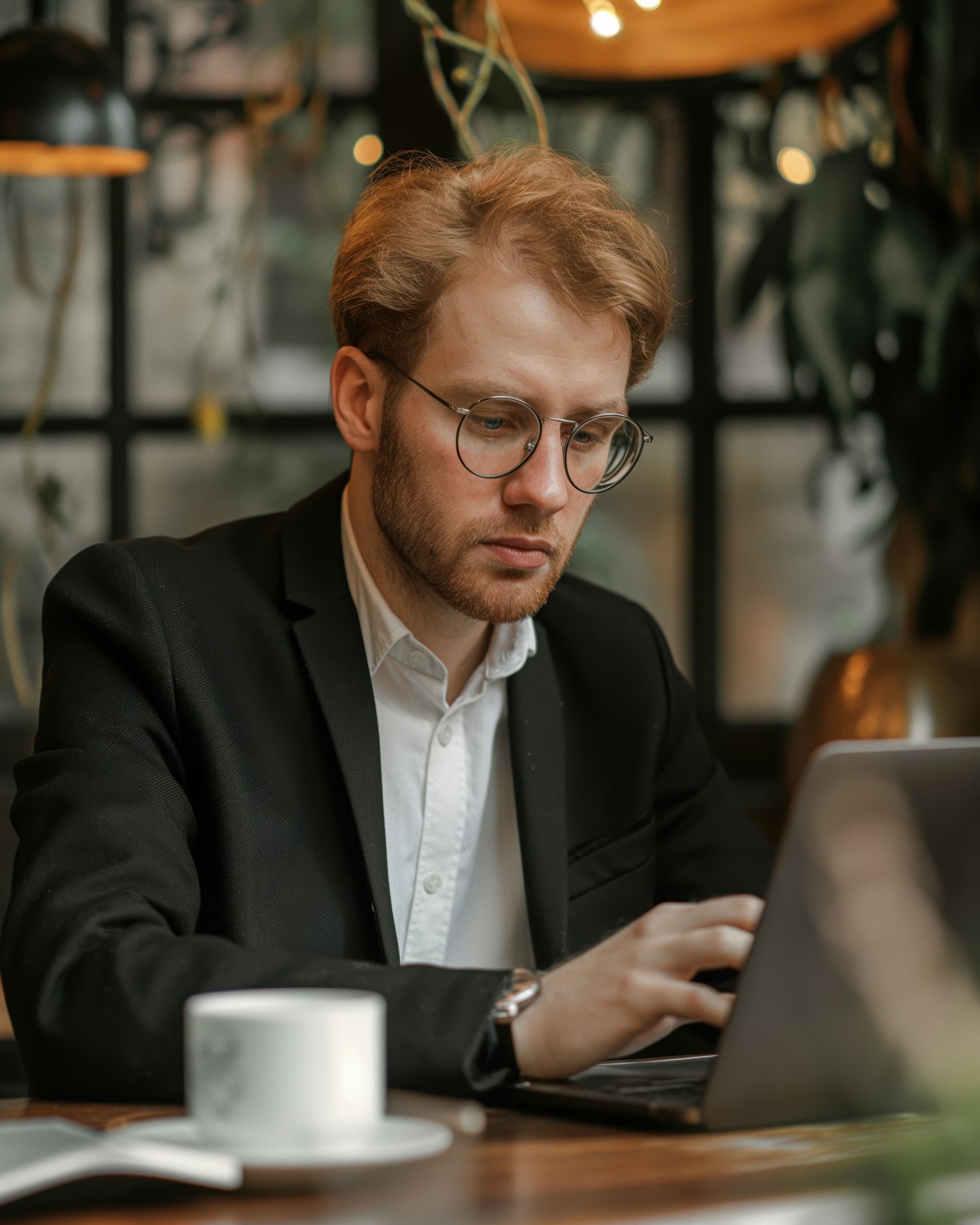 Focused man in glasses working on a laptop in a cozy café with warm lighting and greenery, dressed in a blazer and white shirt.