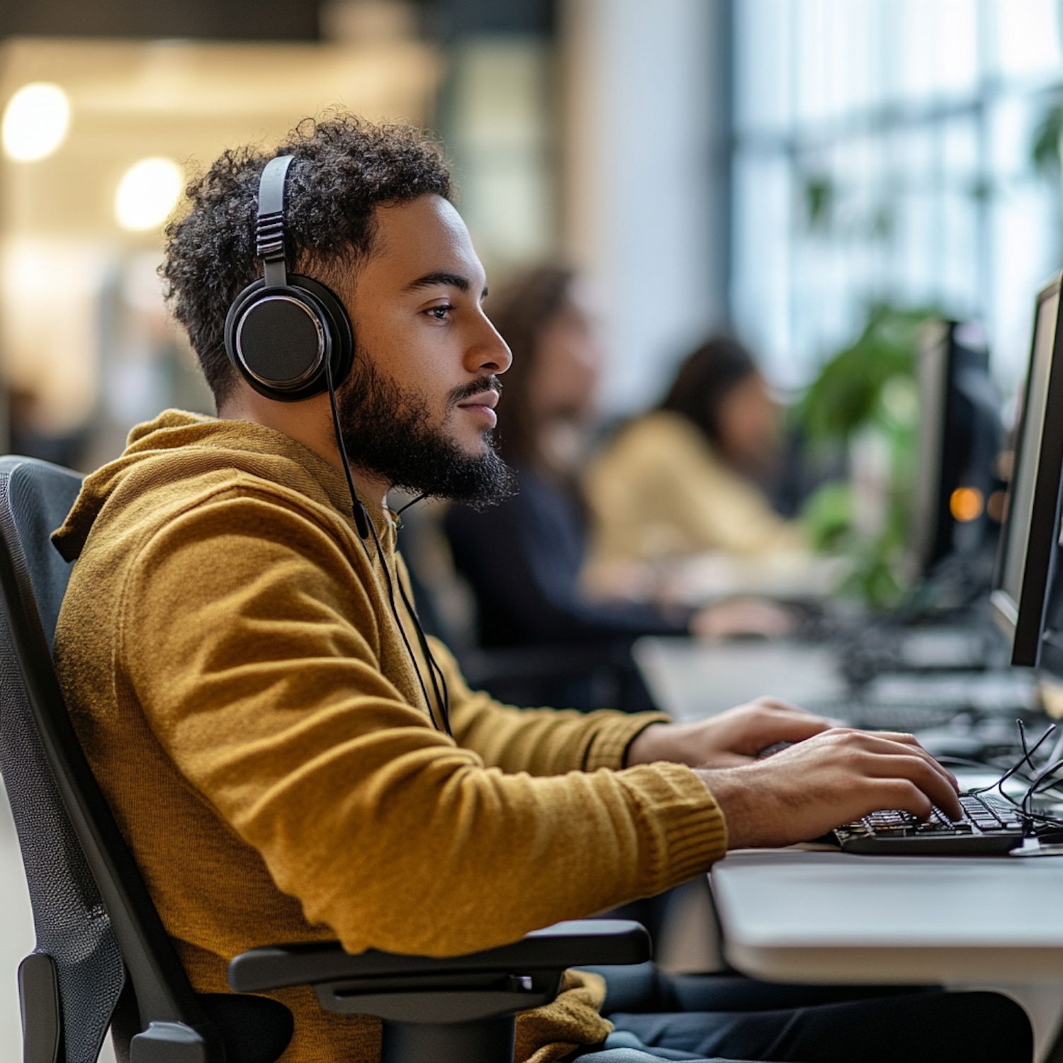 Focused young man in headphones working at a computer in a modern office setting, wearing a mustard hoodie.