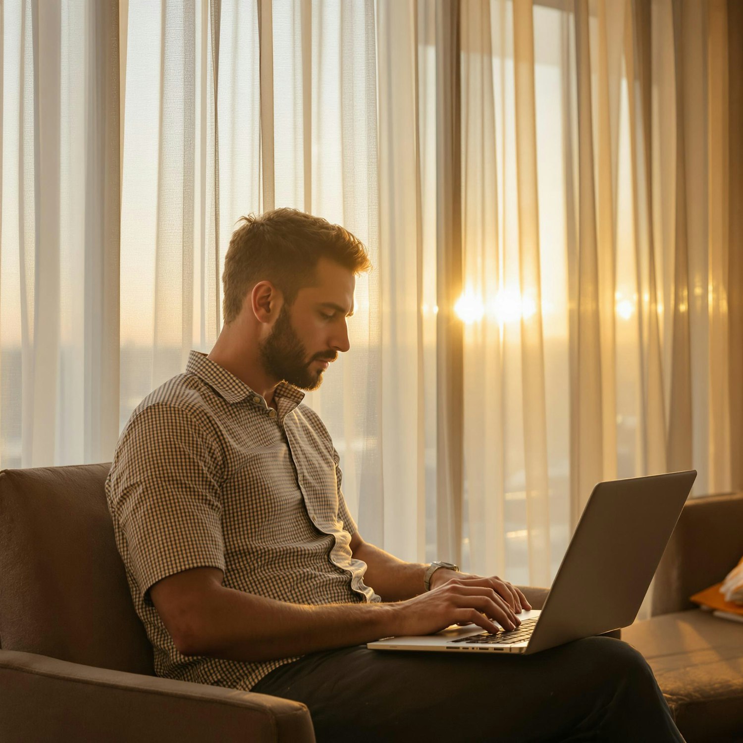 Man with a beard working on a laptop in warm sunlight, sitting on a sofa with sheer curtains in the background. Calm and focused vibe.