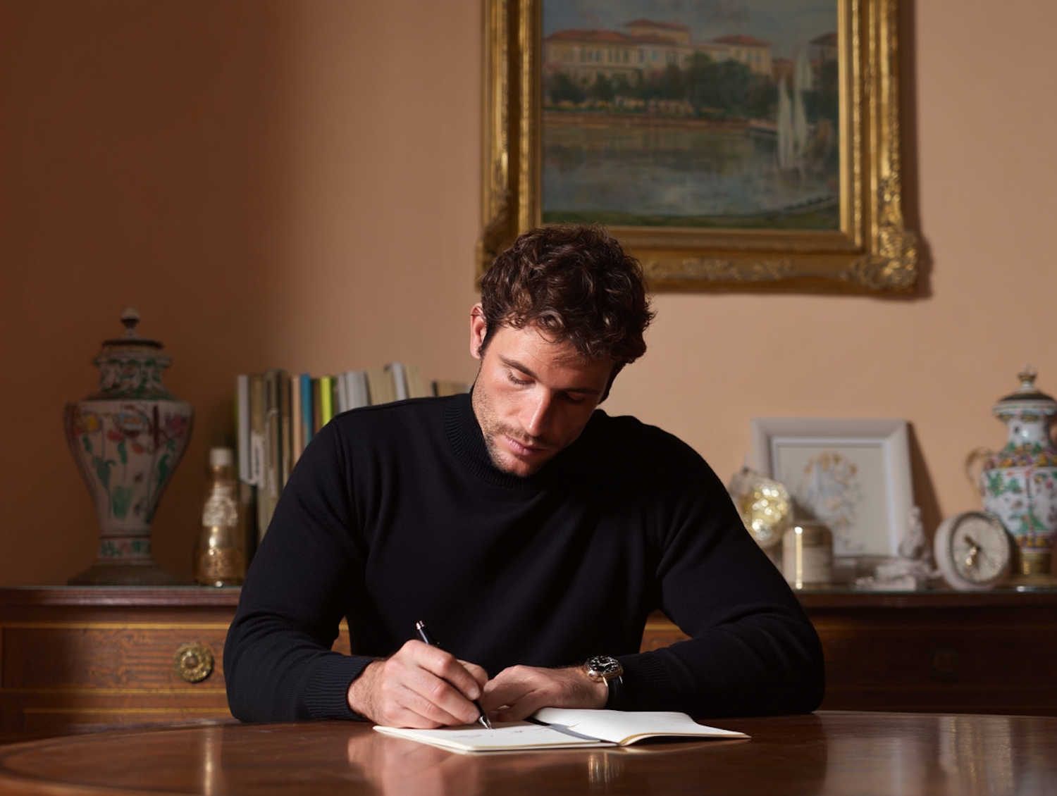 A man sits at a table writing in a warmly lit room, surrounded by elegant decor including vases, a painting, and books.