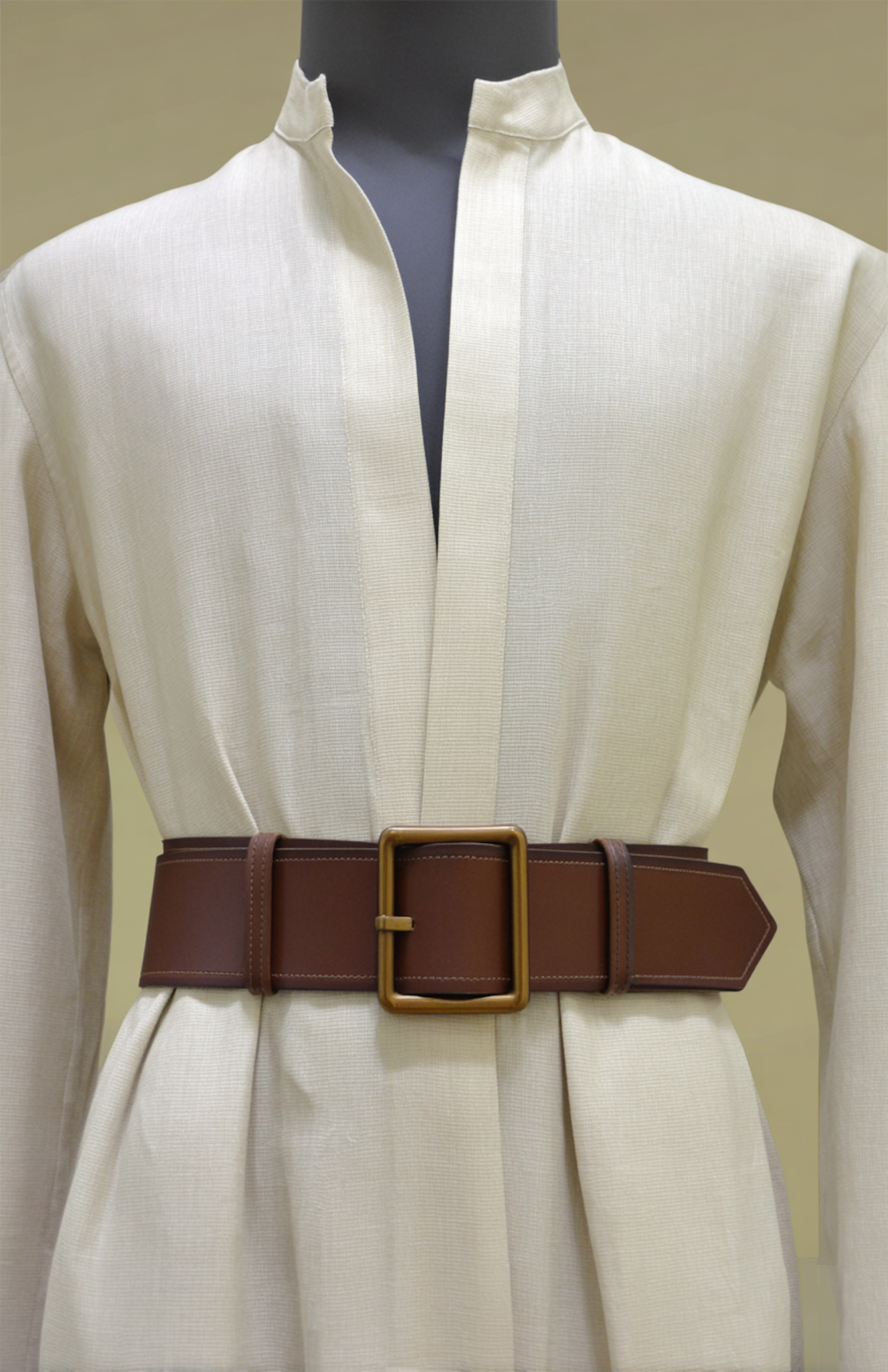 A beige garment with a brown leather belt on a mannequin, showcasing elegant design and texture.