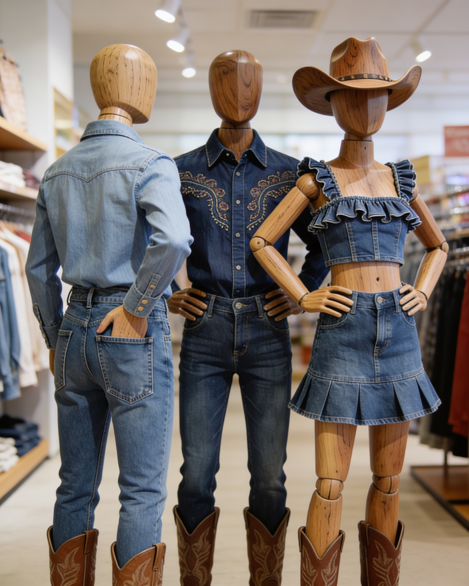 Three wooden mannequins in Western-style denim outfits, including jeans, a skirt, and a cowboy hat, displayed in a store setting.