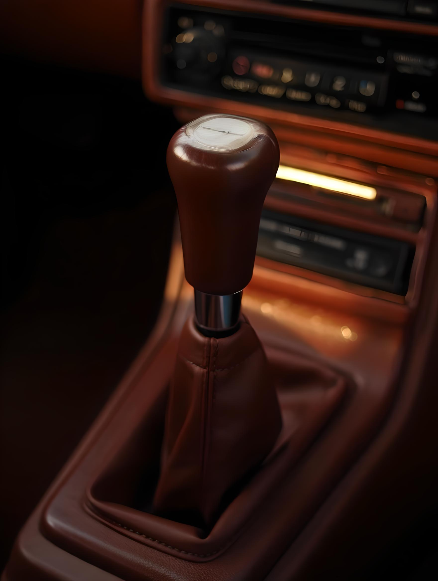 Close-up of a car's manual gear shift with a wooden knob and leather boot, set in a brown console with warm lighting.