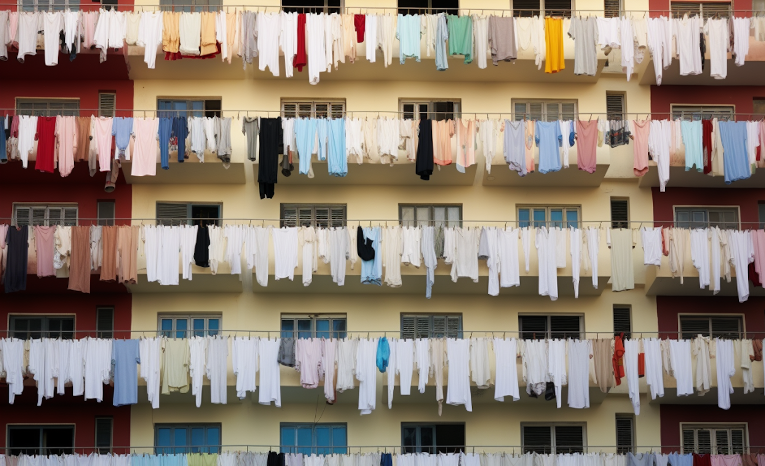 Colorful clotheslines on a residential building's balconies, set against a red and yellow facade, showcasing daily life.