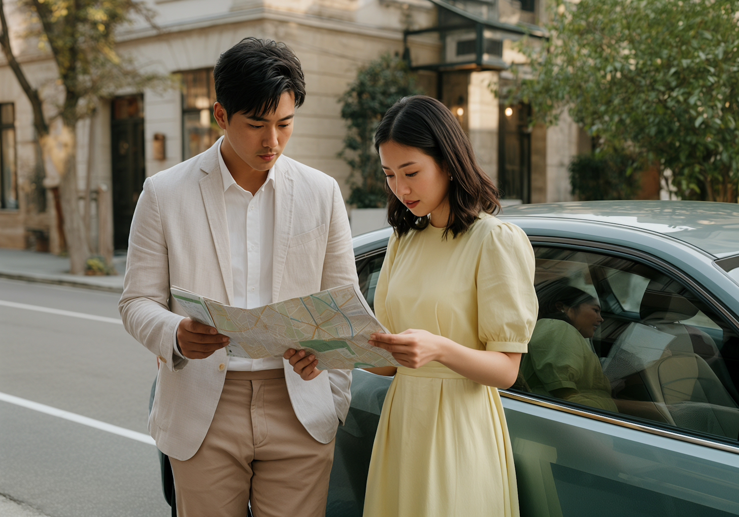 A man and woman study a map near a parked car on a sunny day, surrounded by an urban street with trees and buildings.