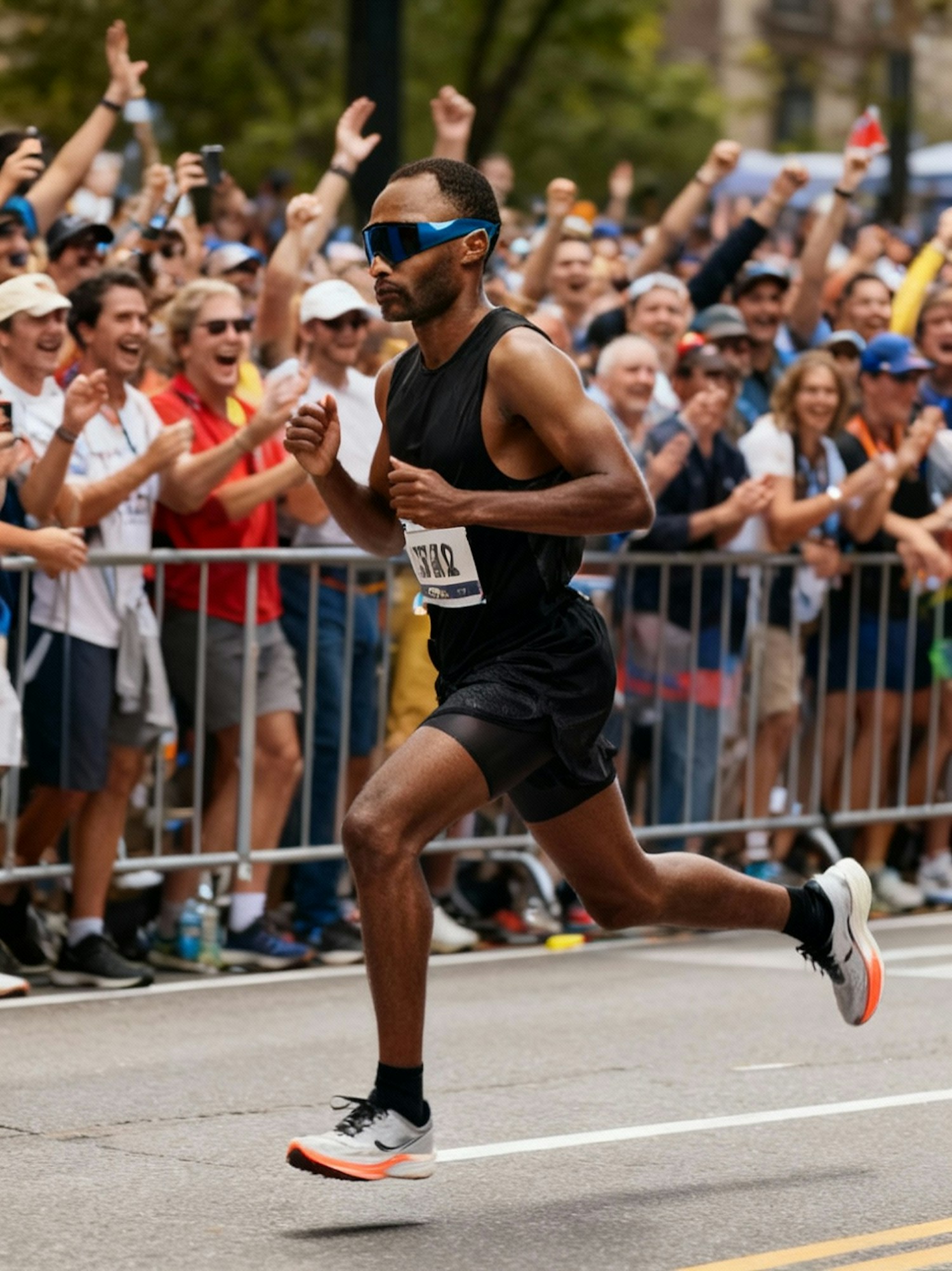A determined runner in a marathon, wearing black gear and sunglasses, with a cheering crowd in the background.