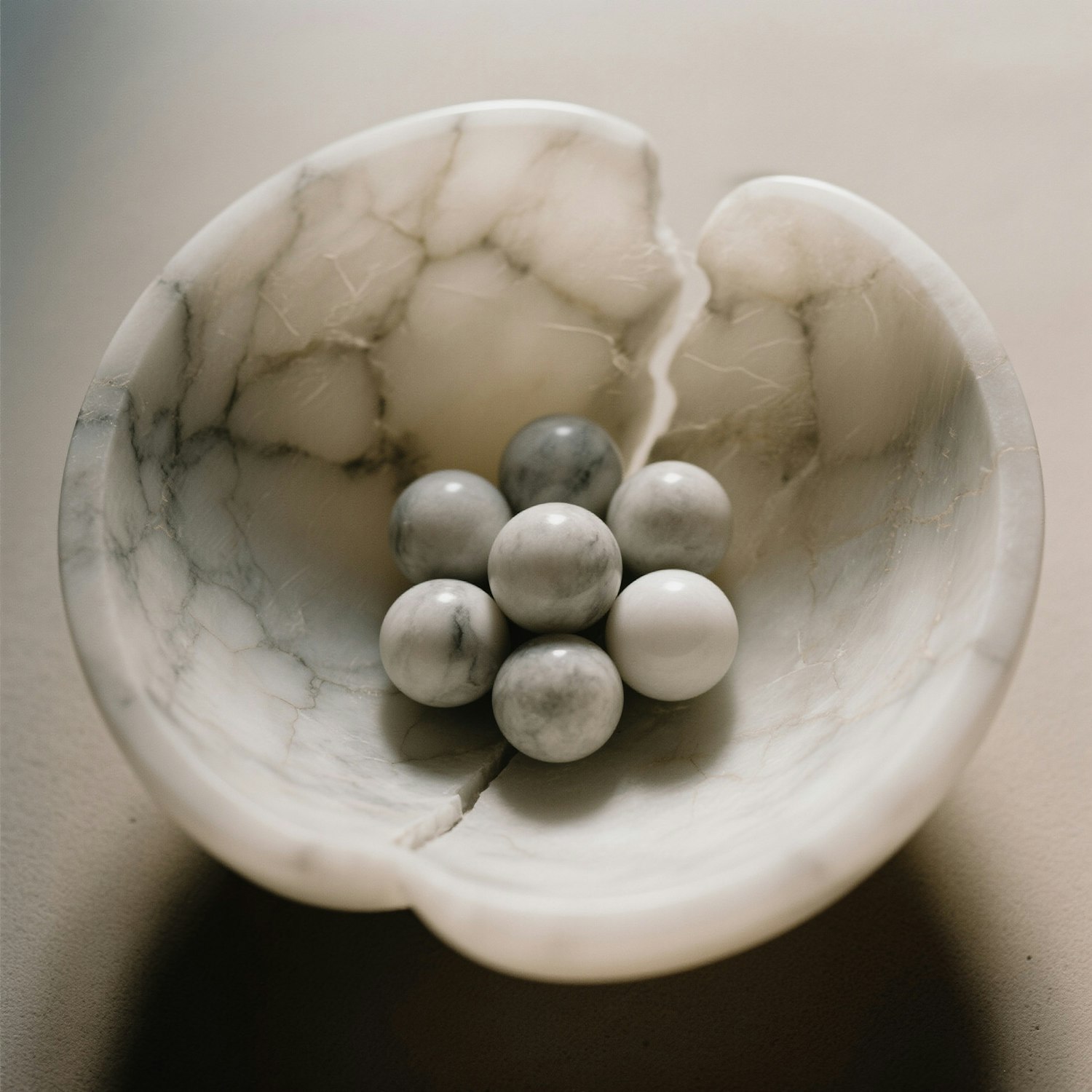 A hand-blown alabaster fruit bowl cracked to reveal marble spheres inside, top-down vignette, subtle tonal contrasts, sophisticated still-life abstraction