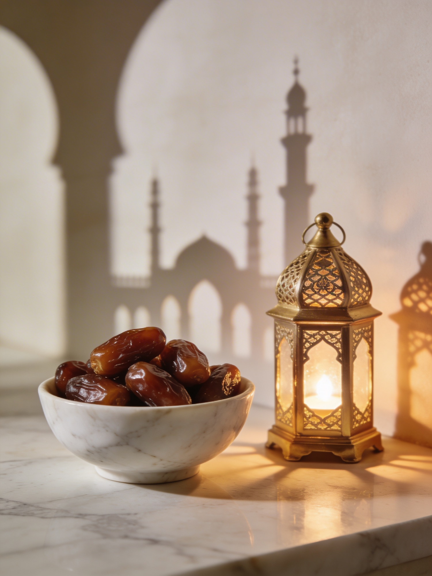 A high‑definition luxury Ramadan still life. A white‑marble bowl filled with dates sits beside a small gold lantern casting a warm glow. Behind them, soft architectural shadows resembling arches and minarets stretch across the wall, creating a serene, high‑end editorial mood. No text, no logos.