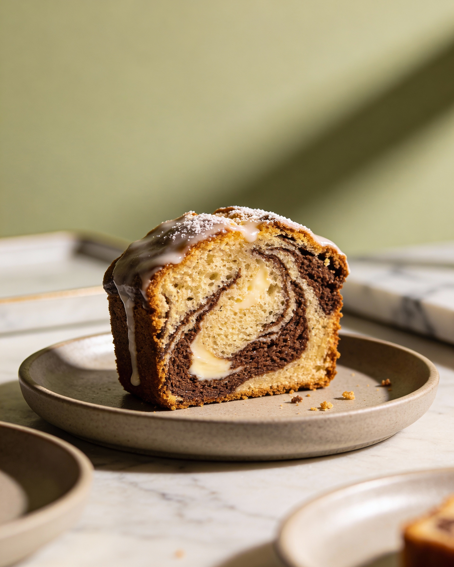 editorial luxury pastry photography, high-end food photography, soft natural light coming from the side, subtle long shadows, calm and refined atmosphere, pale khaki green tones, real pastry shop environment, marble or light stone work surfaces, ceramic plates and trays, soft matte textures mixed with glossy accents, shallow depth of field, premium color grading, ultra realistic textures, macro-level detail, no text, thick slice of marble pound cake, visible vanilla and cocoa swirls, light sugar glaze on top, placed on ceramic plate, minimal crumbs, refined look