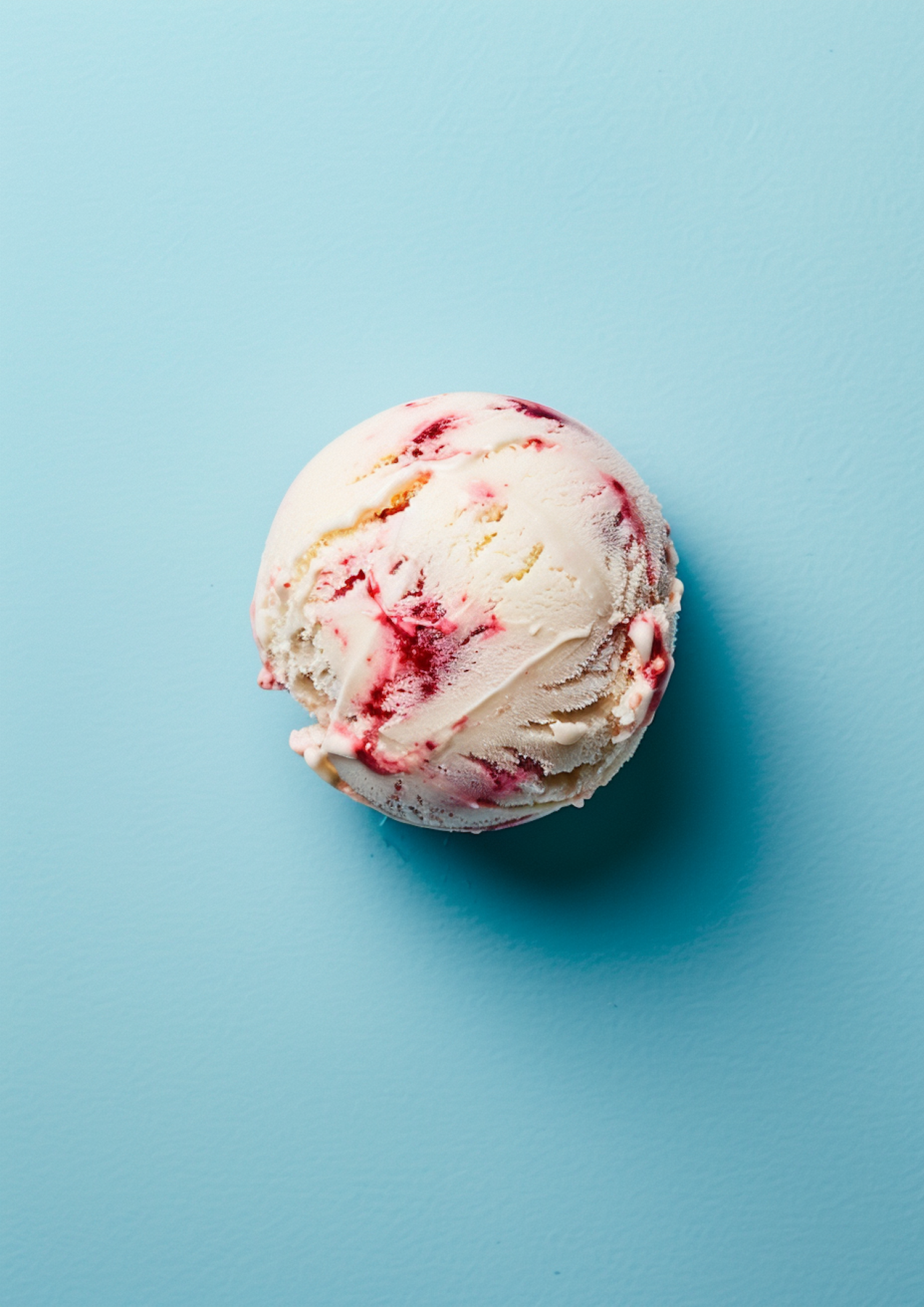 Delicious vanilla ice cream scoop with raspberry swirls on a pastel blue background, highlighting its creamy texture and vibrant colors.