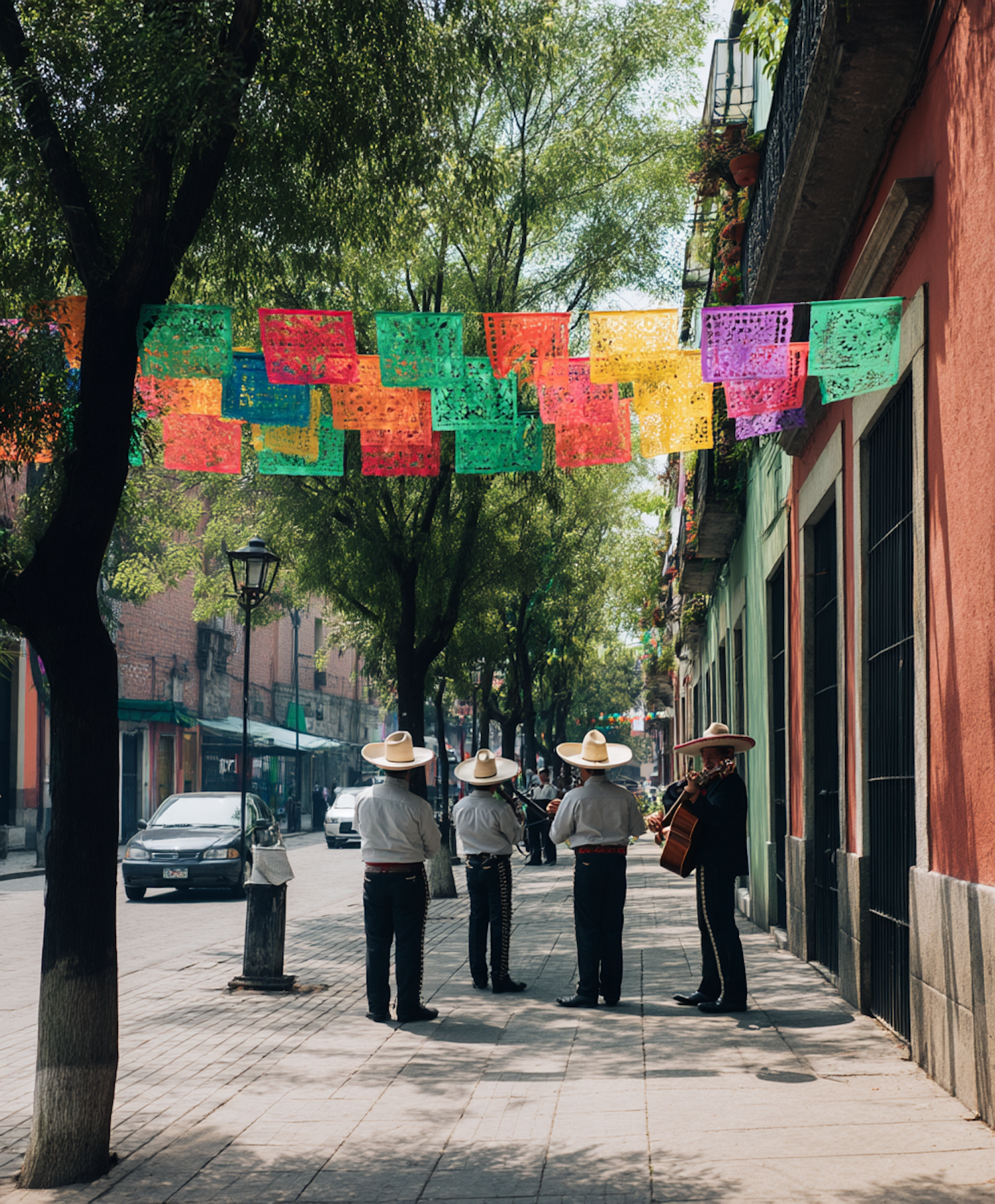 Four mariachi musicians perform under colorful papel picado decorations on a sunny, tree-lined street with vibrant buildings.