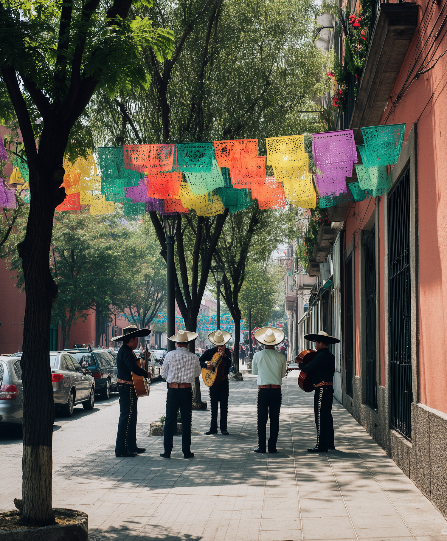 A lively mariachi band performs under colorful papel picado decorations on a sunny urban street, surrounded by trees and vibrant buildings.