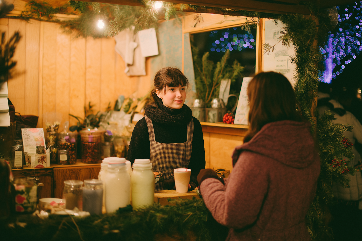 Cozy Christmas market scene of a vendor and patron warmly interacting amidst festive jars and greenery.