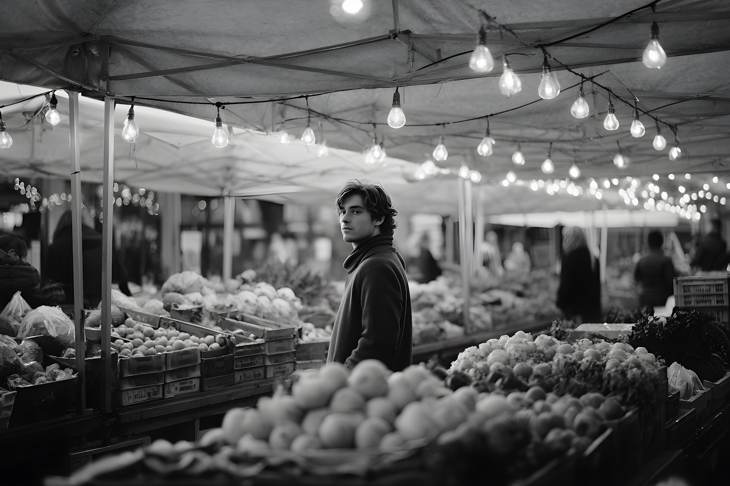A black-and-white photo of a young man in a market, surrounded by produce and string lights, creating a warm and nostalgic atmosphere.