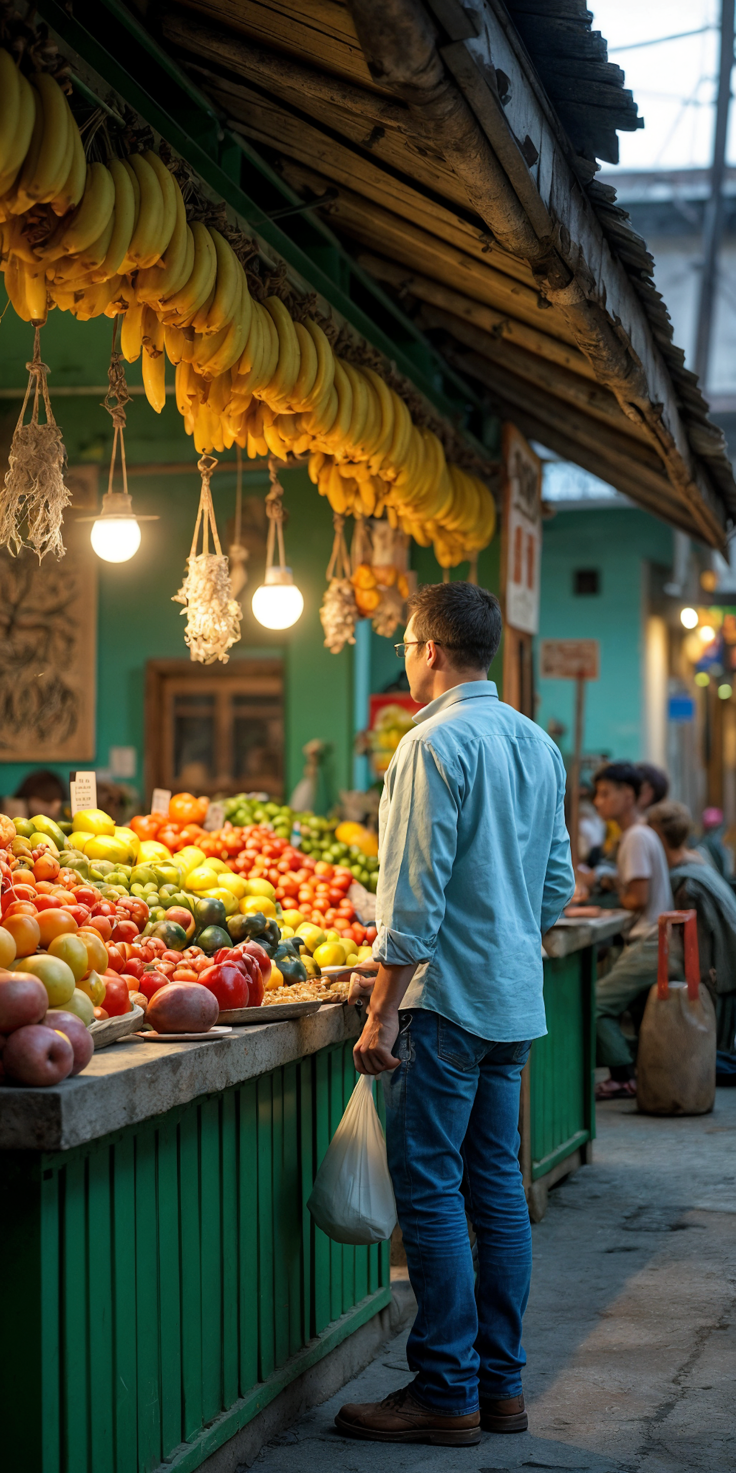 A man shops at a vibrant market stall filled with colorful fruits and vegetables, under warm lighting and a cozy atmosphere.
