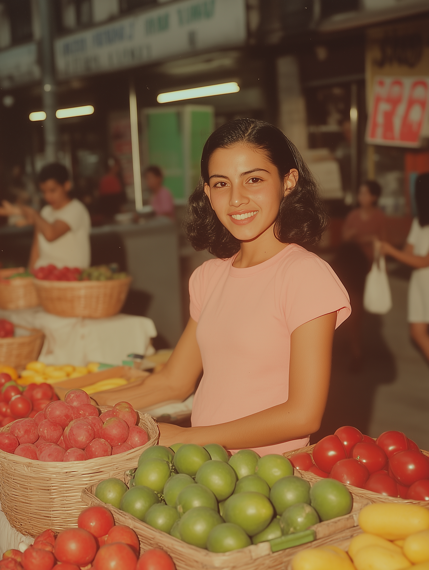 Smiling woman at a vibrant market stall with baskets of fresh fruits, including apples, limes, and mangoes, in a lively setting.