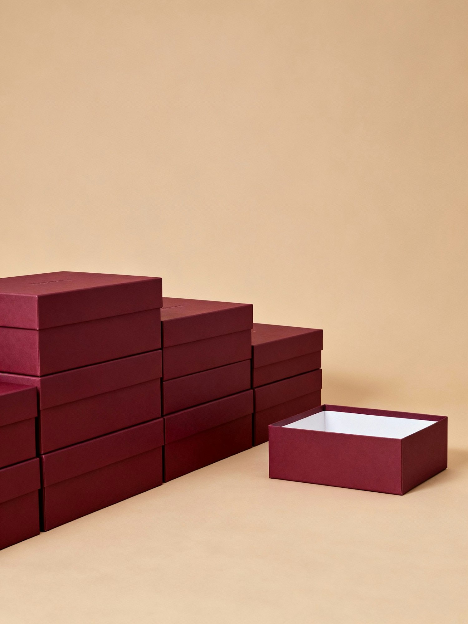 A stack of maroon boxes with one open, showcasing a clean white interior, set against a beige background for a minimalist aesthetic.