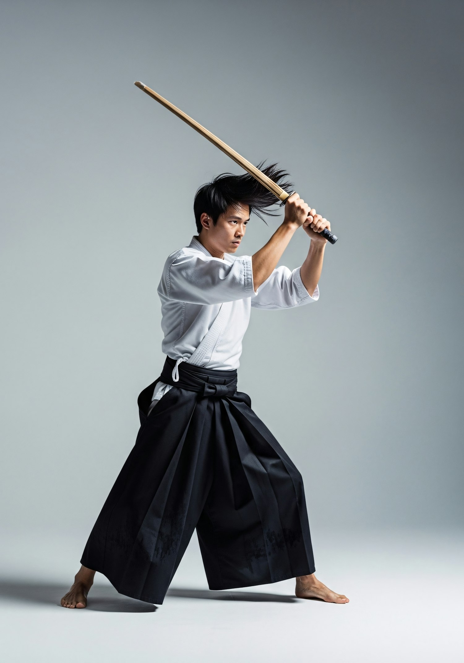 Martial artist in traditional attire holding a wooden sword in a dynamic pose, showcasing focus and precision against a neutral background.