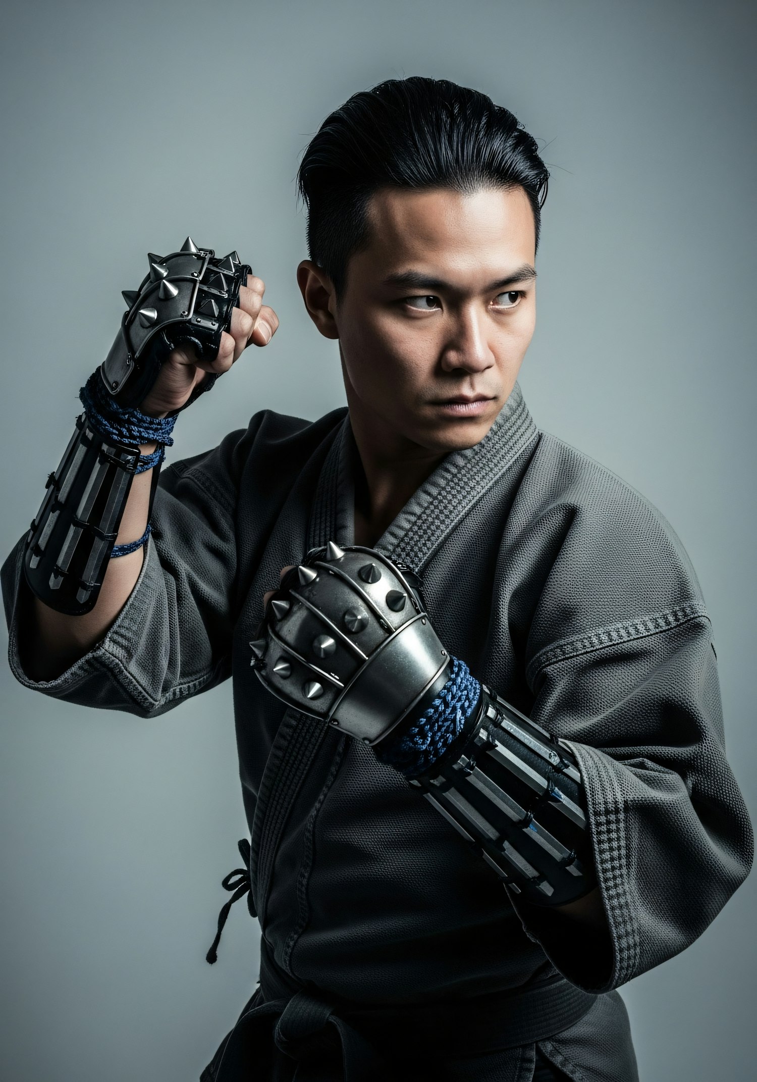 Martial artist in a gray gi with spiked gauntlets, striking a dynamic pose against a neutral background.