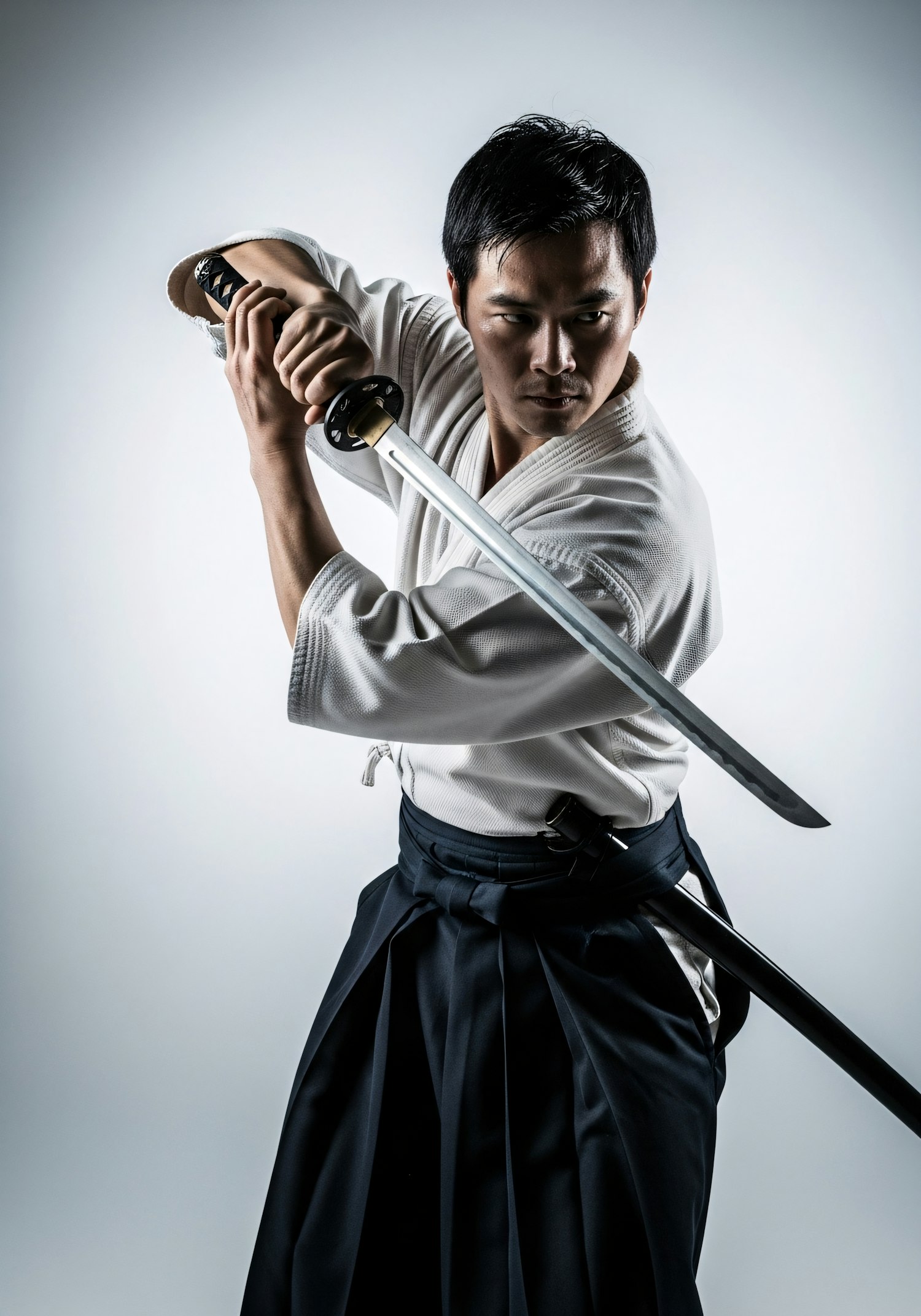 A martial artist in traditional attire holds a katana in a poised stance, showcasing focus and discipline against a neutral background.