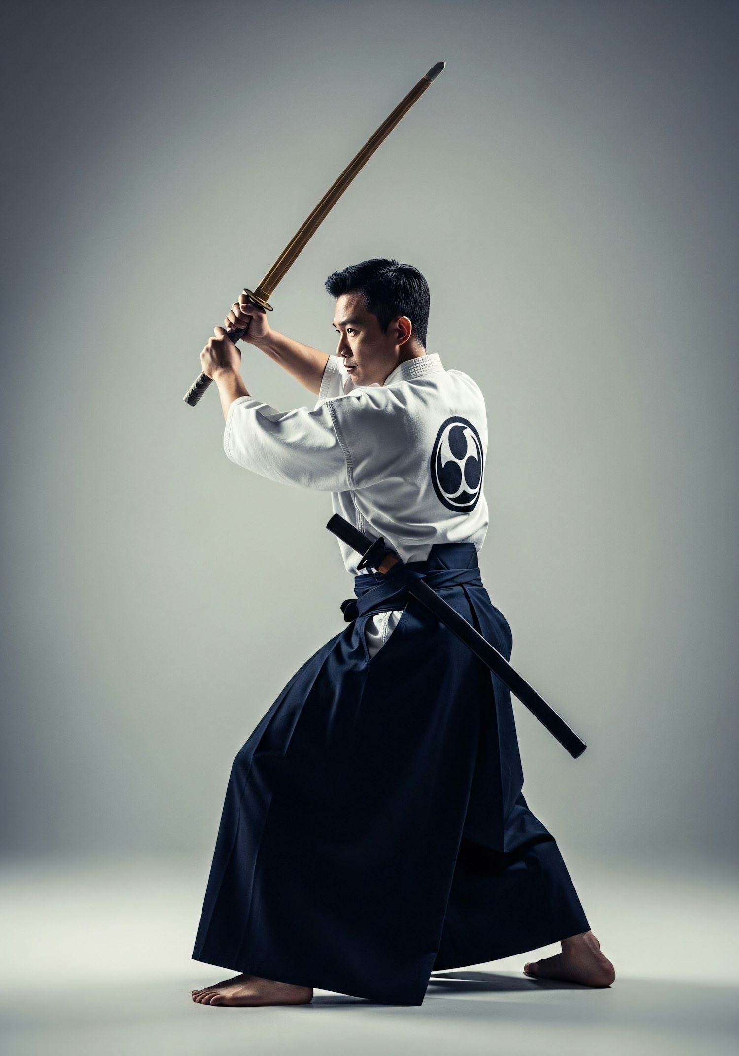 A martial artist in traditional attire holds a katana in a poised stance, showcasing discipline and focus against a neutral background.